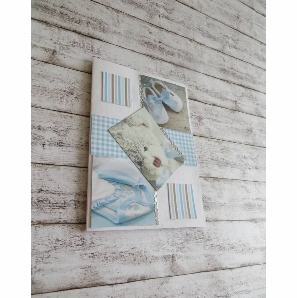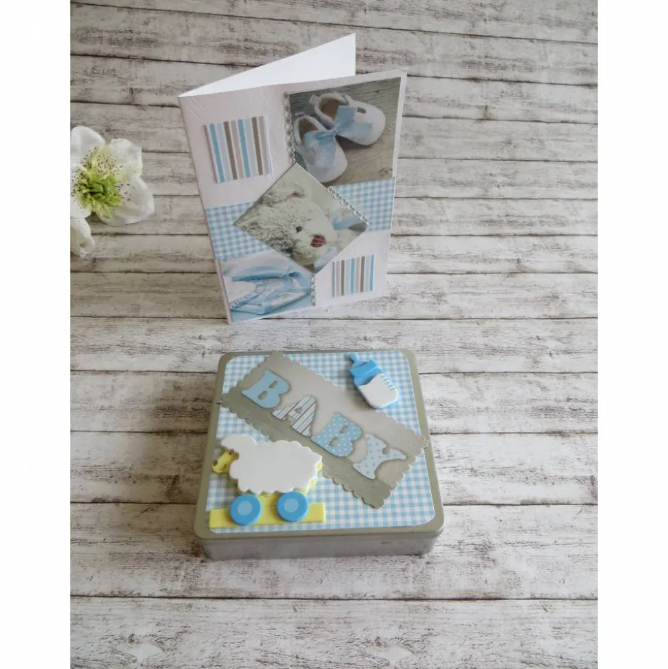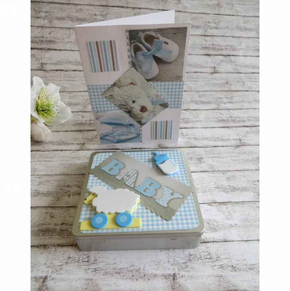Die Geldgeschenkverpackung selbst ist aus Weißblech, mit Scharnier zum Öffnen. Sie ist verziert mit bedrucktem Karton und Dekoelementen passend zum Baby.