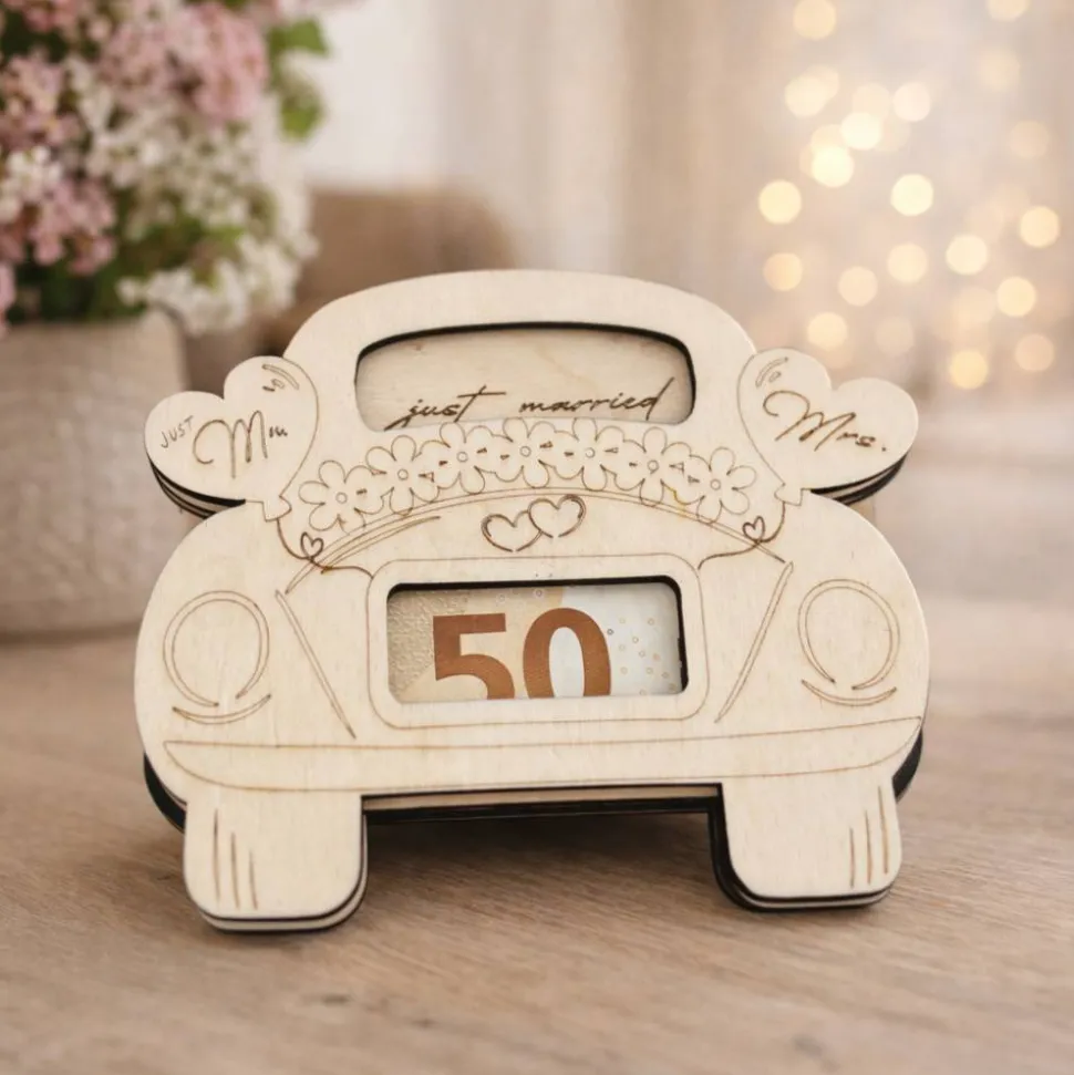 Das eingesteckte Geldschein-Fenster macht die Verpackung nicht nur praktisch, sondern auch zu einem dekorativen Hingucker. Durch das natürliche Holz und das romantische Motiv eignet sich diese Verpackung perfekt für Hochzeiten, standesamtliche Trauungen oder als liebevolle Überraschung für das Brautpaar.