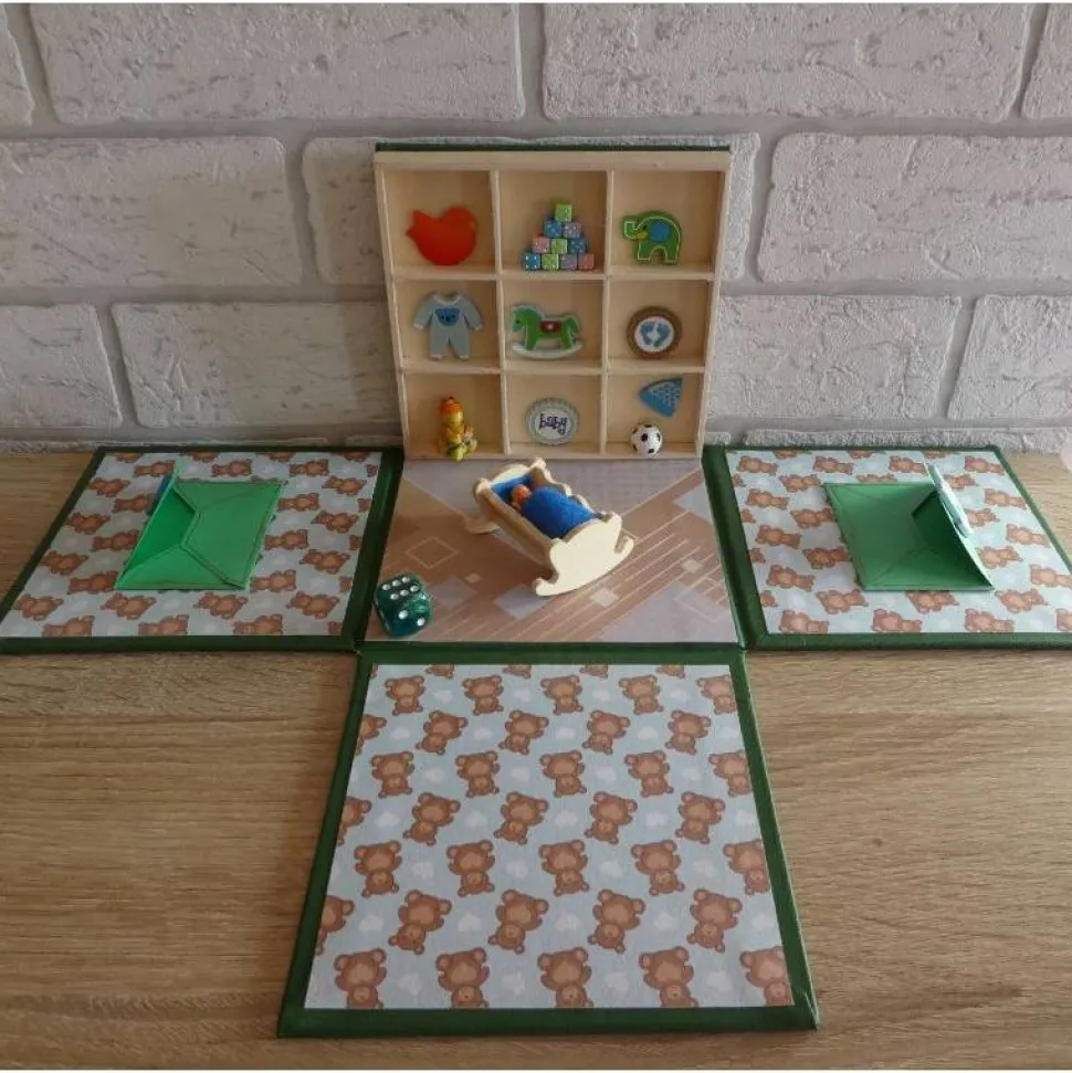 Holzregal mit Spielzeug und Verzierungen