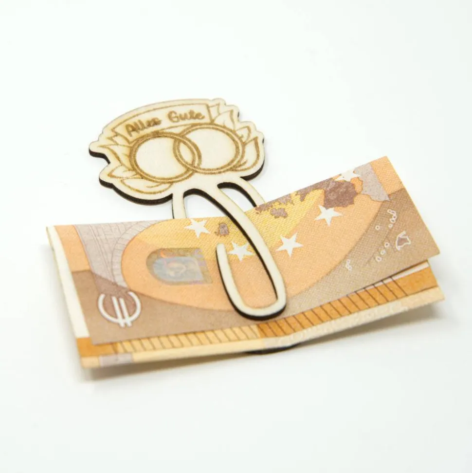 Du weißt nicht, wie du deinen Freunden oder Verwandten „nur“ Geld schenken kannst? Hier ist die Lösung! Unsere Geldspange aus Holz macht aus einem simplen Geldschein ein individuelles und stilvolles Präsent. Damit wird dein Geschenk nicht nur wertvoll, sondern auch einzigartig.