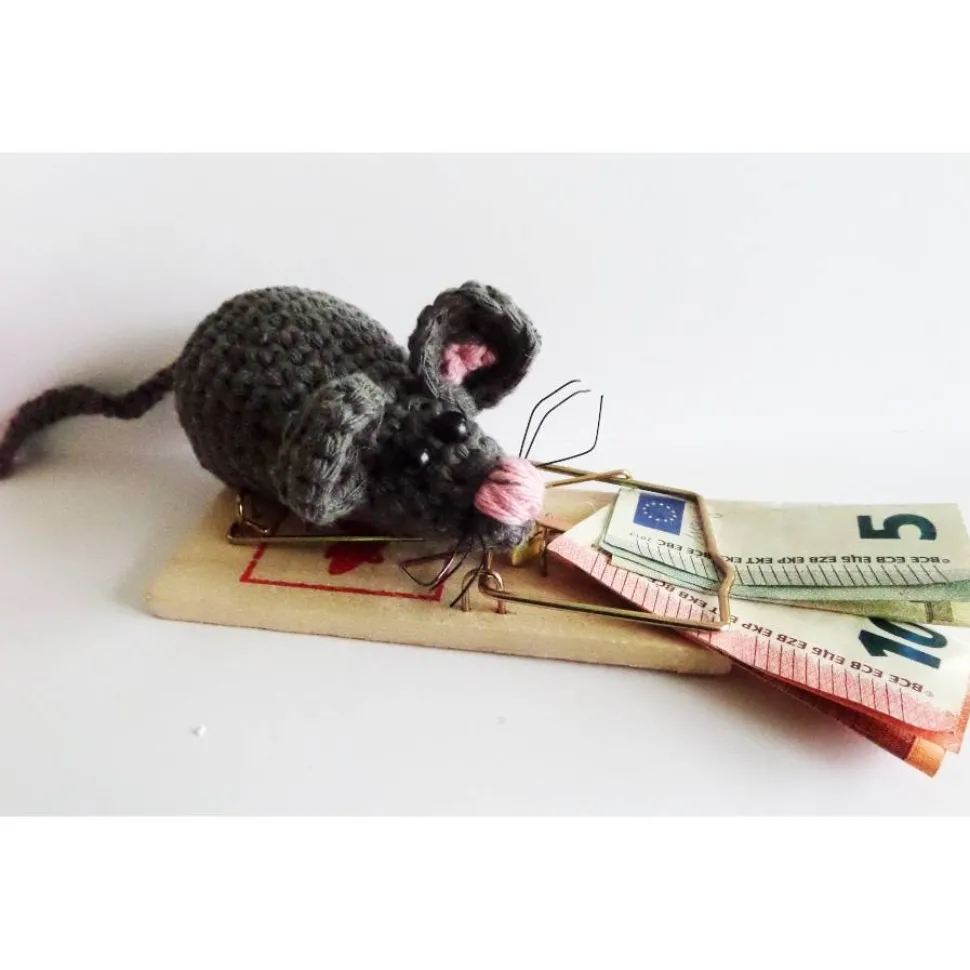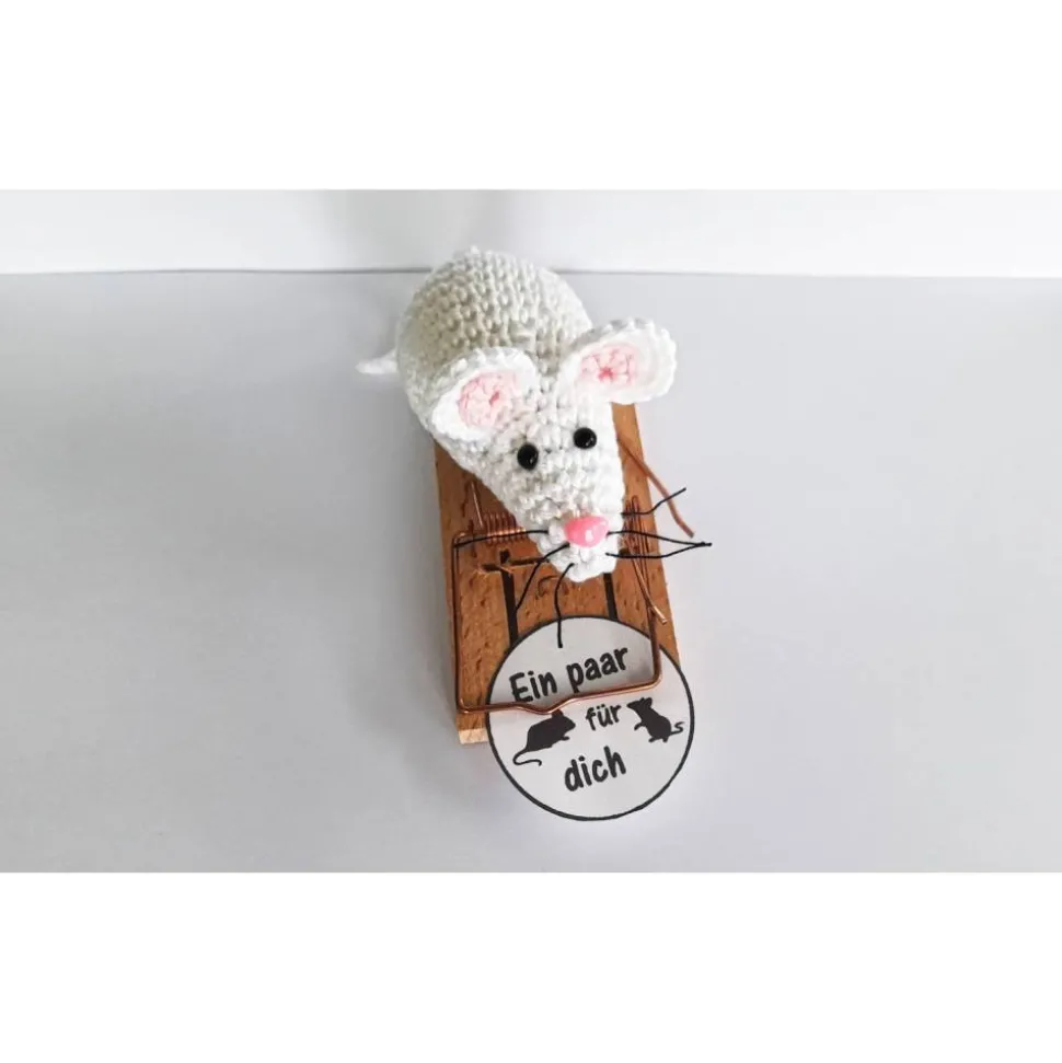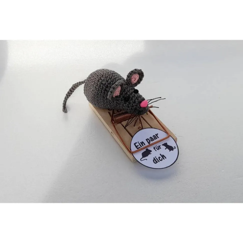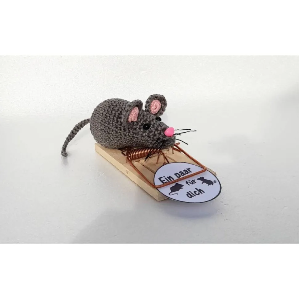 Die Maus wird aus 100 % Baumwolle gehäkelt, mit Füllwatte gefüllt, mit Kunststoffaugen und Nase.