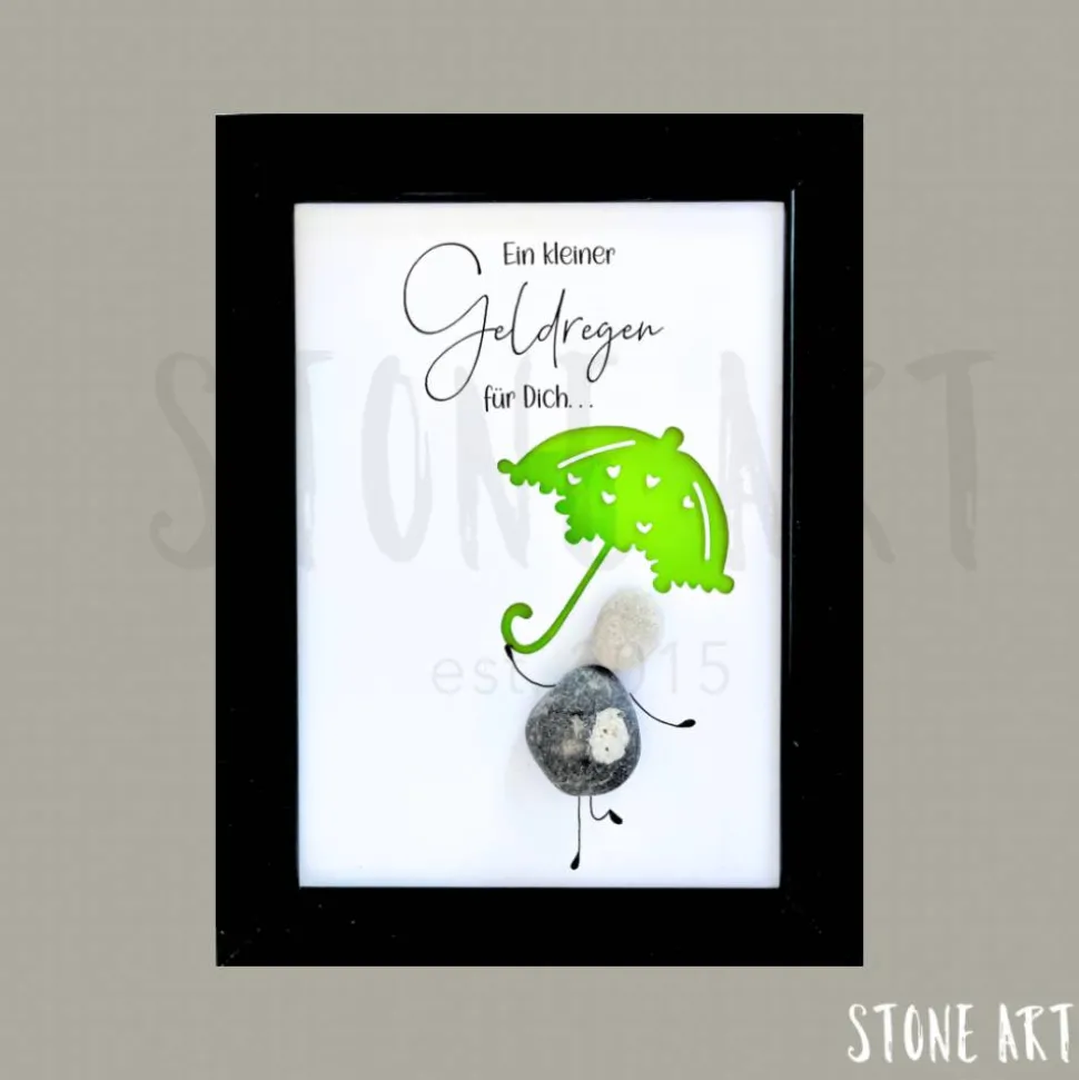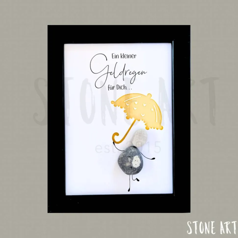 Überrasche mit dem handgefertigten Geldregen Steinbild – das originelle Geldgeschenk für jeden Anlass! Die detailreiche Kieselsteinfigur hält einen Regenschirm und lädt den symbolischen Geldregen ein. Dieses Steinbild steht für Glück, Wohlstand und die besten Wünsche und macht dein Geldgeschenk zum absoluten Highlight.