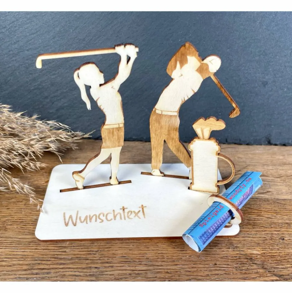 Für Golfpaare und echte Golffans! Diese aus Holz gefertigte Golferin und der Golfer sind eine stilvolle und originelle Möglichkeit, einen Geldschein zu verschenken. Liebevoll gestaltet und detailreich gearbeitet, symbolisieren sie gemeinsame Leidenschaft für den Golfsport. Ideal für Geburtstage, Jubiläen oder als besonderes Geschenk mit persönlichem Charakter.