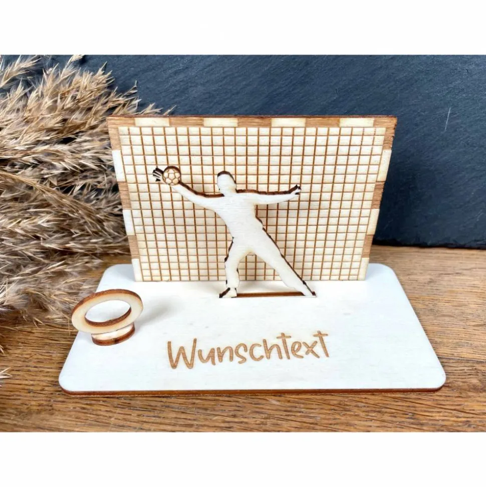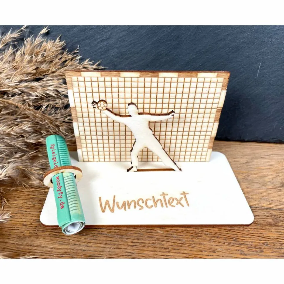 Für echte Handballfans! Dieser aus Holz gefertigte Handball-Torwart ist eine besondere und sportliche Möglichkeit, einen Geldschein zu verschenken. Name und Trikotnummer sind personalisierbar und machen das Geschenk einzigartig. Liebevoll gestaltet und detailreich gearbeitet, ist es ideal für Torhüter, Fans oder Trainer – persönlich, kreativ und mit Herz.