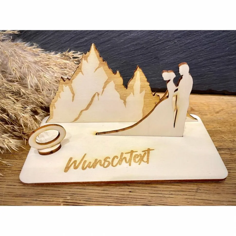 Ein Geschenk voller Liebe und Fernweh! Dieses aus Holz gefertigte Hochzeitspaar mit Bergen als Hintergrund ist eine besondere und stilvolle Möglichkeit, einen Geldschein zu verschenken. Es symbolisiert gemeinsame Wege, Abenteuer und eine Zukunft voller Höhen und Glücksmomente. Liebevoll gestaltet, ist es perfekt für naturverbundene Paare.