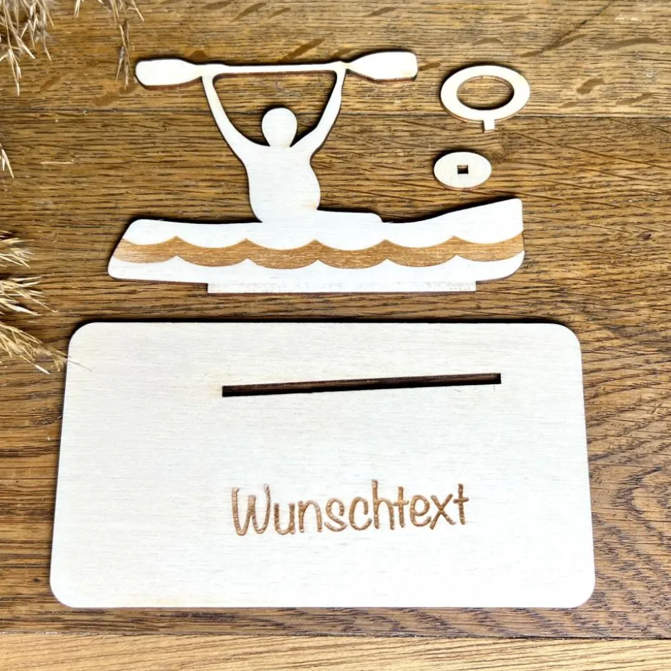 Für alle, die Ruhe und Natur lieben! Dieses aus Holz gefertigte Kanu mit einer Person ist eine stilvolle und originelle Möglichkeit, einen Geldschein zu verschenken. Es steht für Freiheit, Entspannung und Zeit für sich selbst. Liebevoll gestaltet und detailreich gearbeitet, ist es das perfekte Geschenk für Solo-Abenteurer und Naturliebhaber.