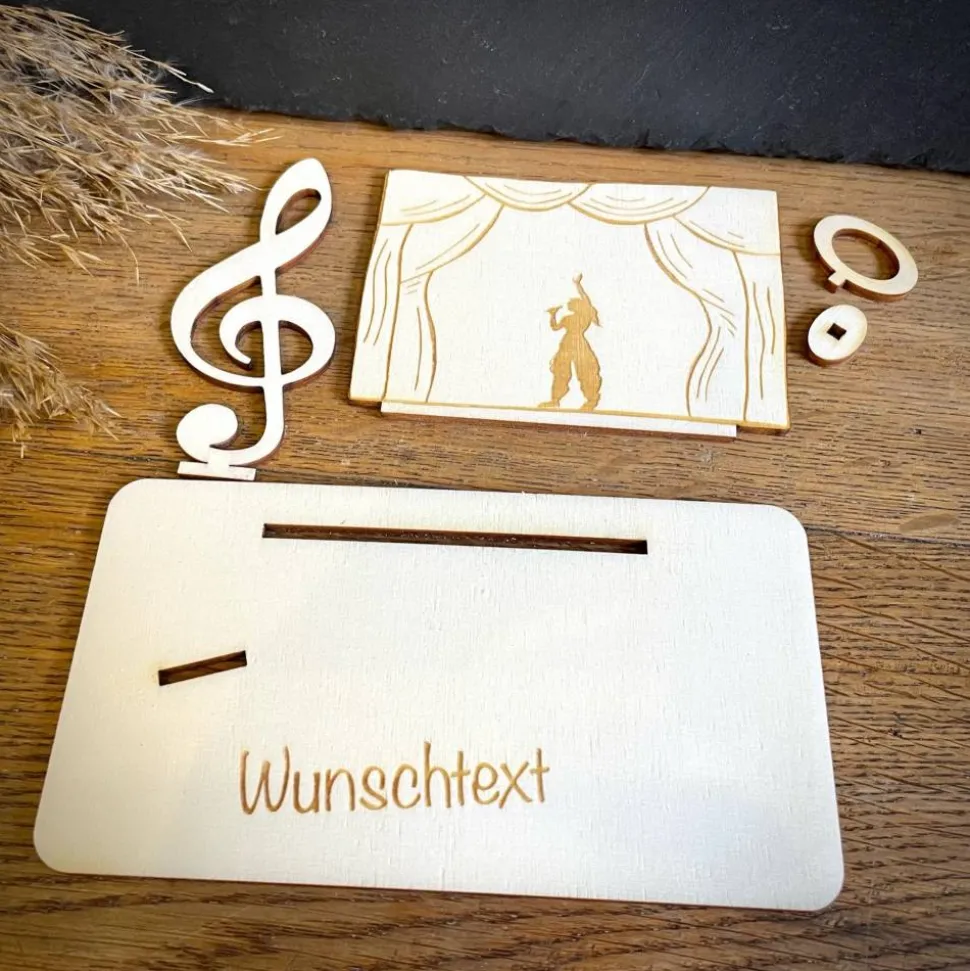 Du suchst das perfekte Geschenk für echte Kulturfans? Mit diesem hochwertigen Holzaufsteller verschenkst du Vorfreude auf das nächste Konzert, Theater oder Musical! Schiebe einfach einen Geldschein in den Geldring und fertig ist deine stilvolle Finanzspritze für das nächste Ticket. Ein bleibendes Erinnerungsstück, das garantiert besser ankommt als ein simpler Umschlag. Viel Spaß beim Verschenken!