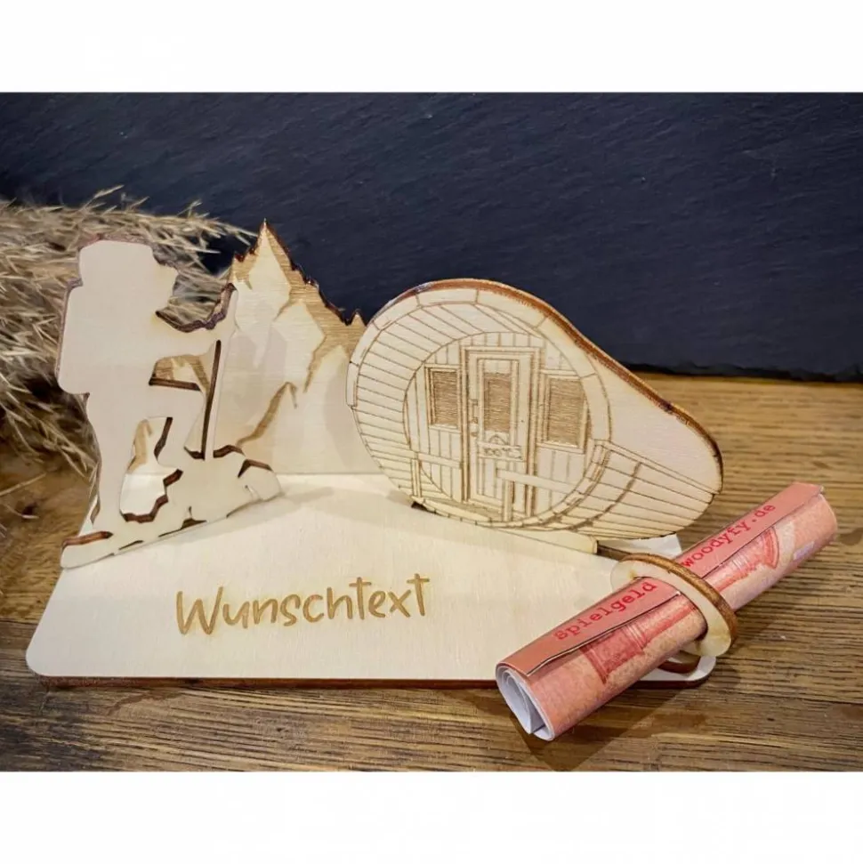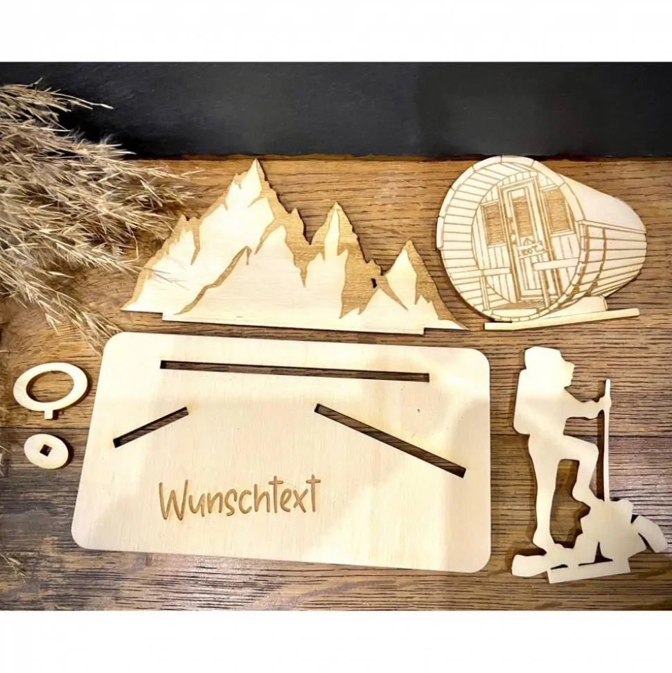 Der Geldscheinhalter besteht aus mehreren Teilen, die zusammengesteckt und verklebt werden. Der Geldscheinhalter kann mit Acrylfarben oder Poscastiften bemalt werden.