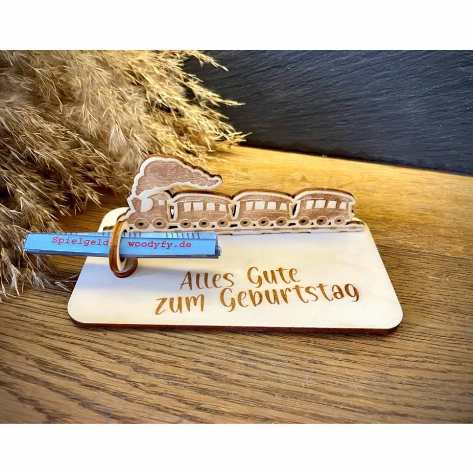 Verschenke Reiselust auf besondere Art! Dieser aus Holz gefertigte Zug ist eine kreative Möglichkeit, einen Geldschein zu verschenken. Ideal für Bahnliebhaber, Reisefans oder neue Lebensabschnitte. Das liebevoll gestaltete Design steht für Aufbruch, Abenteuer und neue Wege – ein Geschenk mit Symbolkraft und ganz viel Charme.