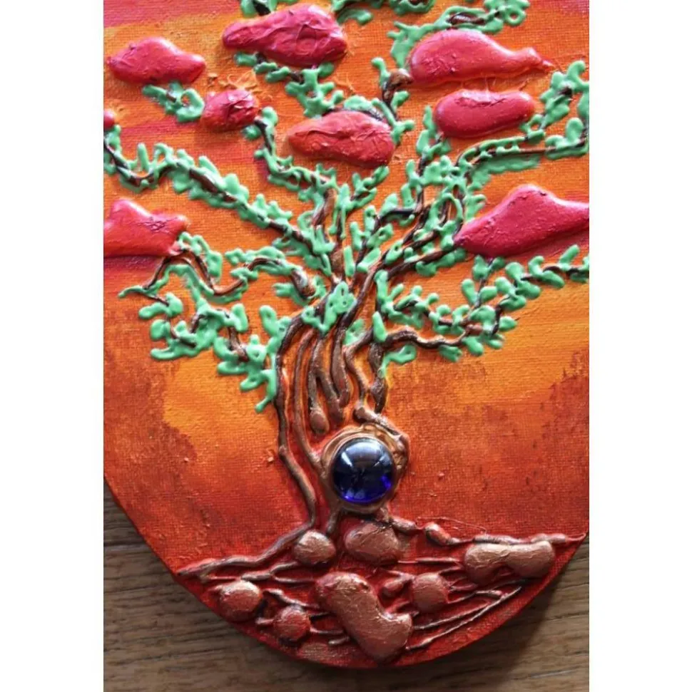 Zauberhaftes Acrylbild auf einem ovalen Keilrahmen in leuchtenden Farben. Schöne Effekte durch die Verwendung von Spachtelmasse und metallisch glänzende Farben. Dekoriert mit einem kleinen Glasstein.
