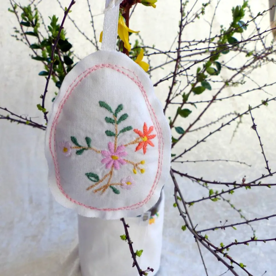 Individuelles Design: Das Stoffei hat auf beiden Seiten ein wunderschönes aufgesticktes Blumenmuster in zarten Farbtönen,– schlicht und edel. Der Stoff ist aus 100 % Baumwolle und wurde bereits oft gewaschen, was ihn besonders weich und langlebig macht. Der Aufhänger aus einem alten Glanzband rundet das Design ab.