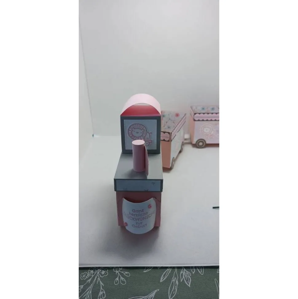In Diesem Zug haben viele Kleine Dinge Platz, die man zur Geburt verschenken kann. Auch Windeln passen in die offenen Wagons. Die Lok des Zuges hat einen Deckel, der abgenommen werden kann, die anderen 2 Wagons sind offen.