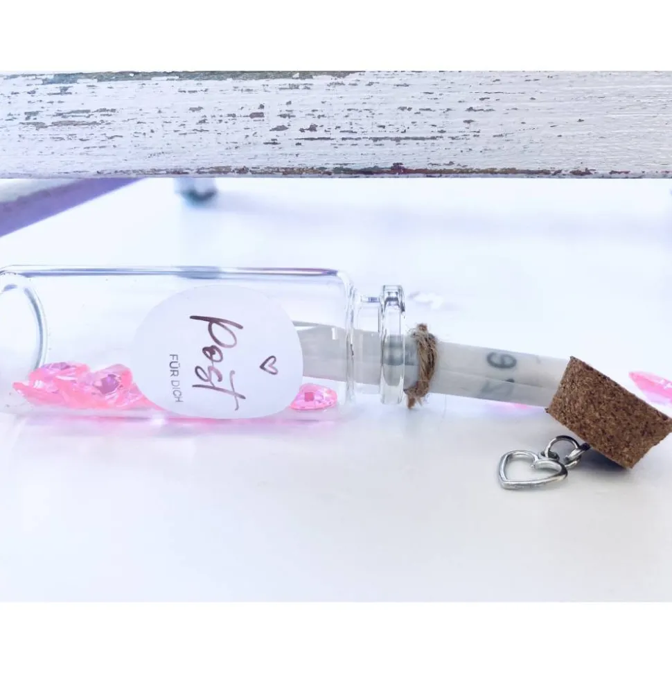 Sie Ist aus Glas und hat einen Korkverschluss in dem ein kleines Herz steckt.