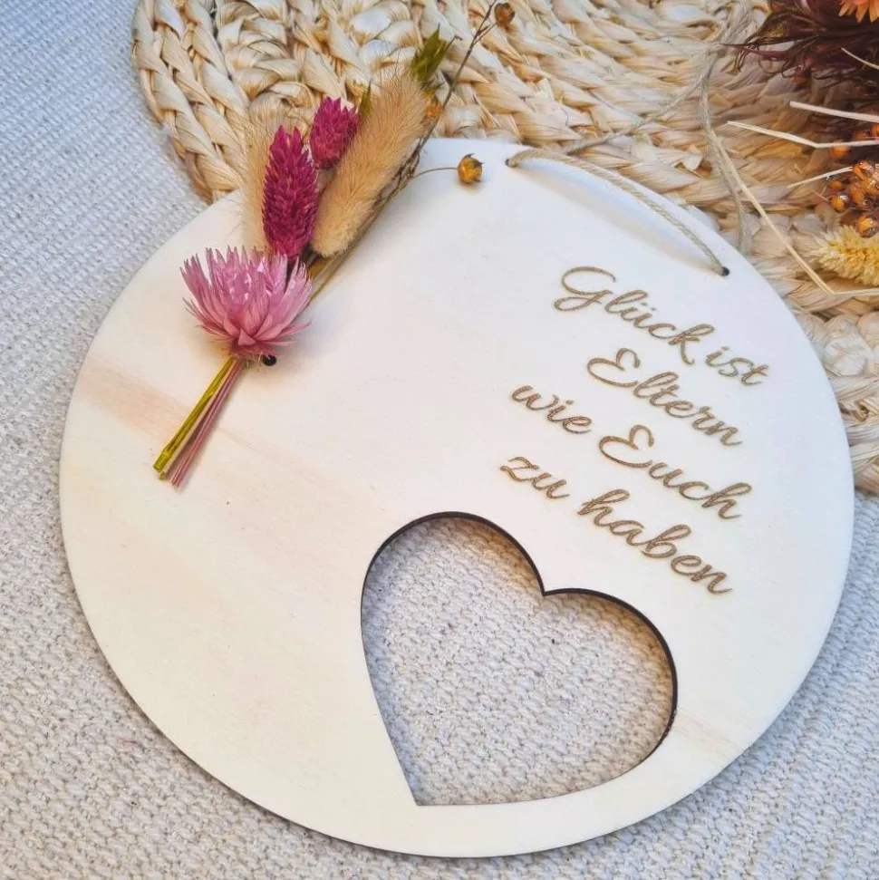 Mach das Zuhause deiner Liebsten mit diesem wunderschönen, personalisierten Türschild aus Holz noch einladender. Jedes Schild wird sorgfältig aus hochwertigem Holz gefertigt und mit einem kleinen, schlichten Trockenblumenstrauß verziert. Dies macht es zu einem idealen Geschenk für deine Eltern. Das Türschild wird mit dem Spruch „Glück ist Eltern wie Euch zu haben“ personalisiert. Die natürlichen Materialien und das handgefertigte Design verleihen jedem Stück einen rustikalen Charme. Dieses personalisierte Holzschild ist nicht nur eine schöne Dekoration für die Haustür oder das Interieur, sondern auch ein liebevolles Andenken, das jahrelang Freude bereiten wird.