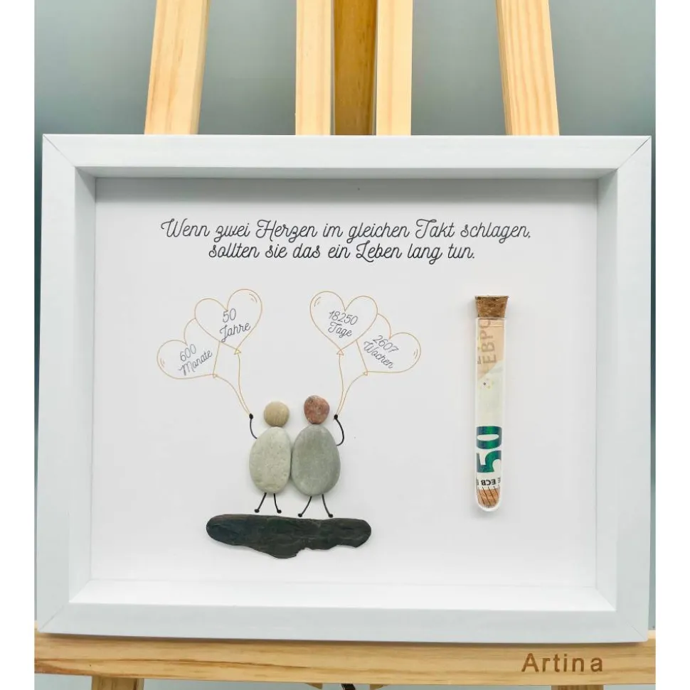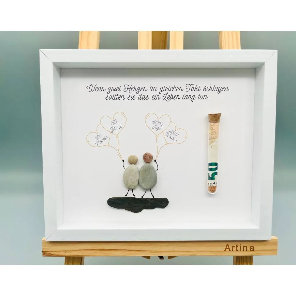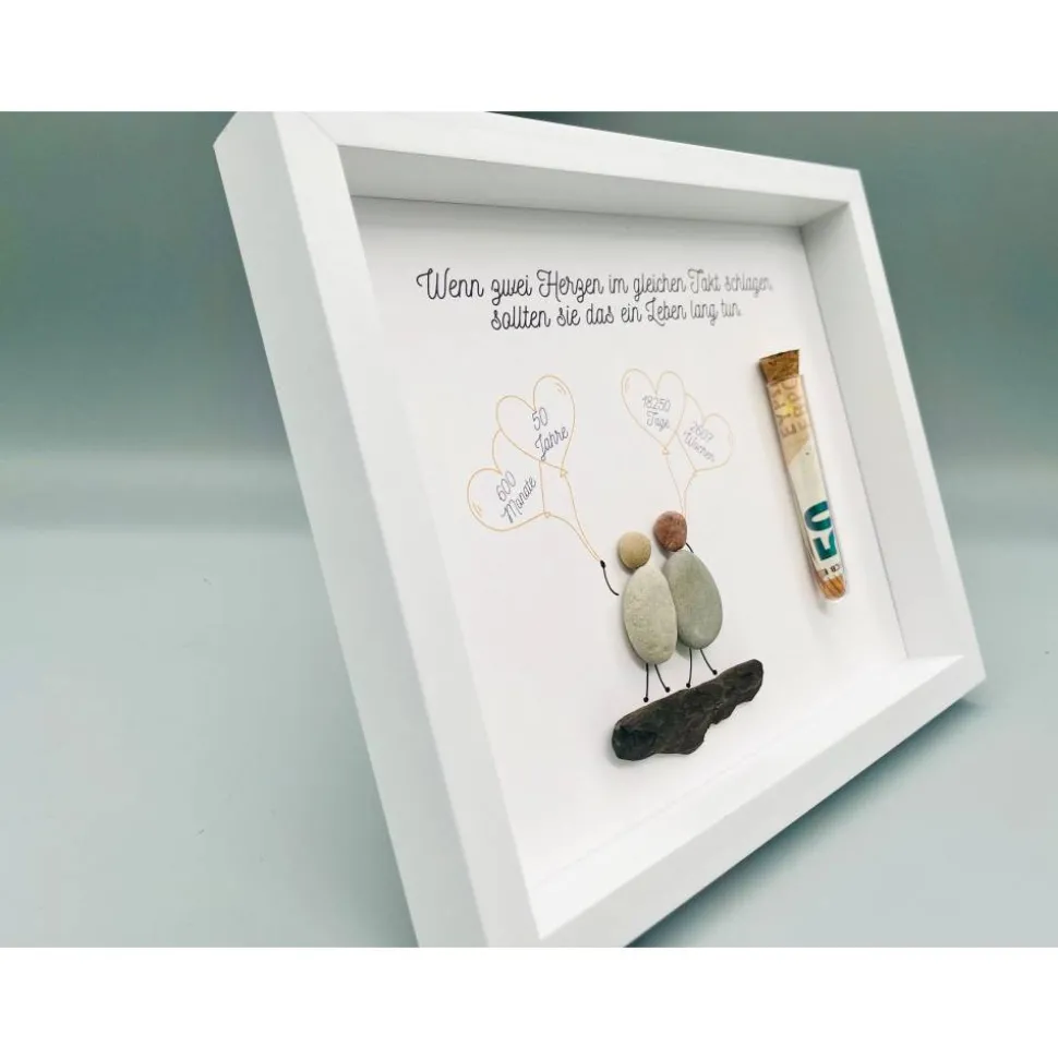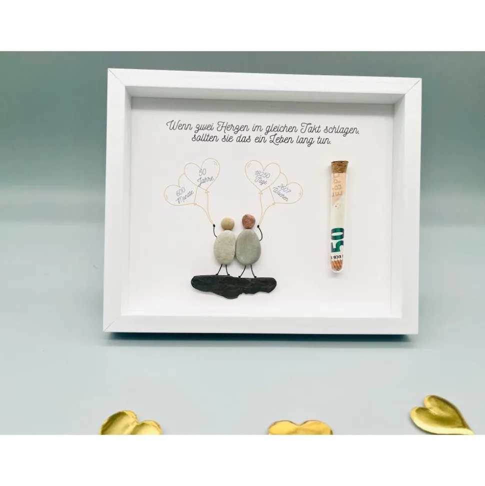 Bist du auf der Suche nach einem einmaligen Geschenk? Dann wirst du dieses Custom Bild aus Steinen und Treibholz lieben! Die Bilder sind echte Blickfänger und visuelle Highlights, die jedem Zimmer eine besondere Atmosphäre und den letzten Schliff verleihen. Die Materialien für das Bild werden von Hand gesammelt und angeordnet, was jedes Bild zu einem echten Unikat macht! Perfekt, um deinen Lieben eine besondere Freude zur goldenen Hochzeit zu machen. Also, worauf wartest Du noch? Lass uns jetzt deine Personalisierungswünsche wissen und wir kreieren dein einmaliges Bild für dich!