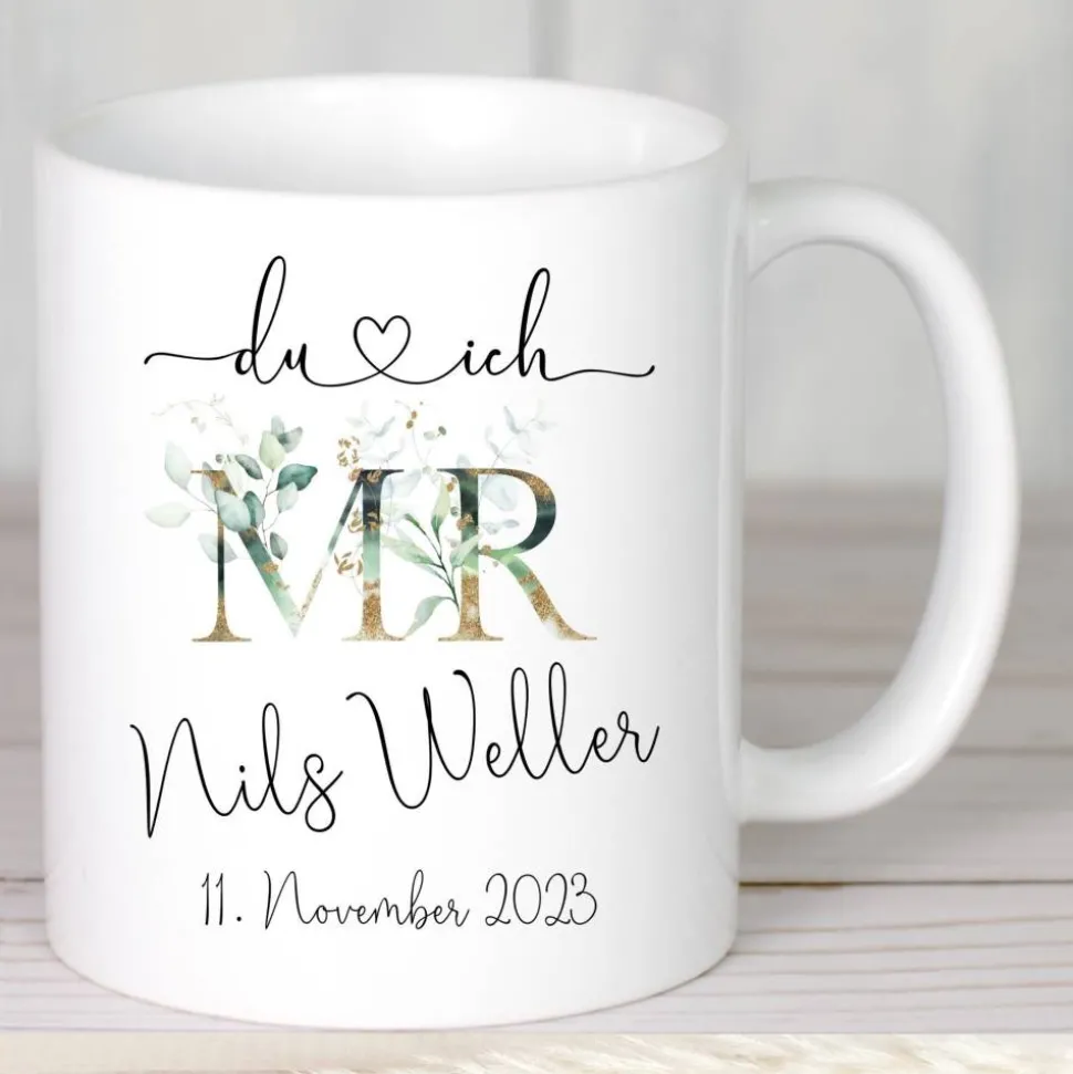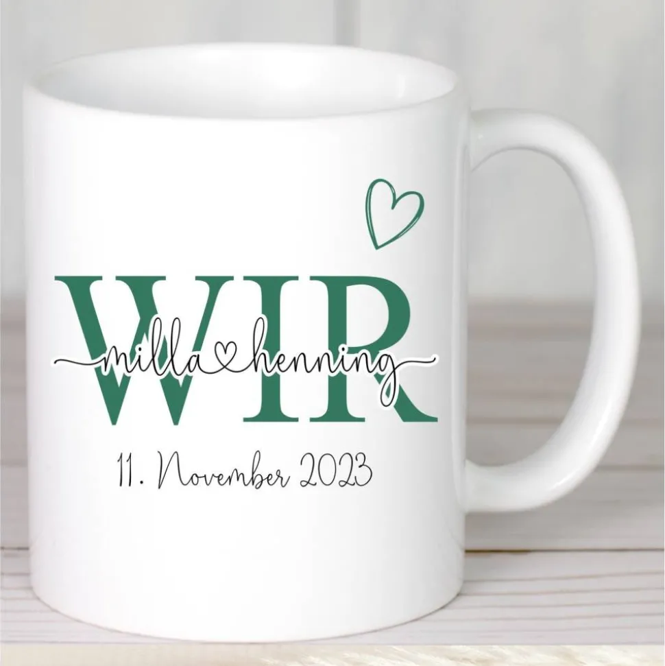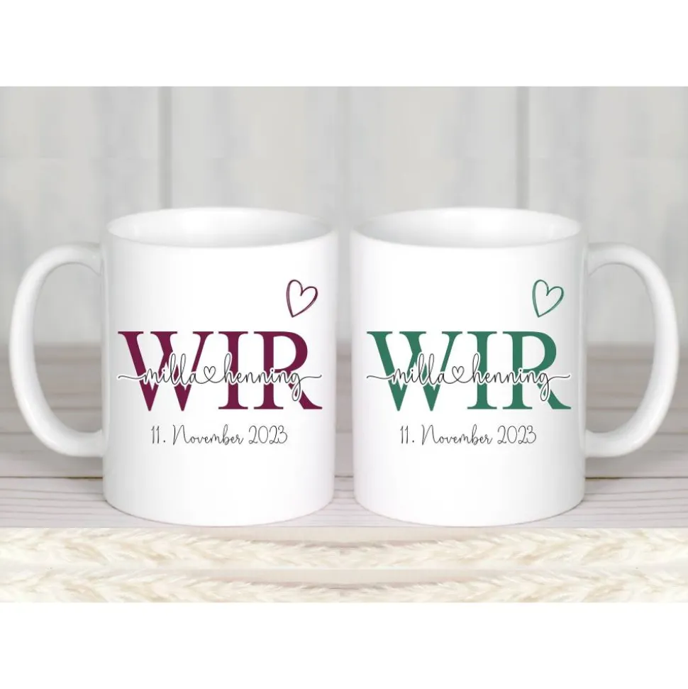 Ihr erhaltet ein Set mit zwei Tassen, die mit den Namen des Brautpaares und dem Hochzeitsdatum