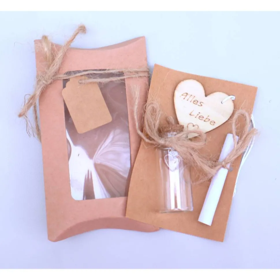 Süße, kleine Geschenk Idee mit Herz. Sie erhalten ein Glas mit einem hübschen kleinen silberfarbigen Metallherz gefüllt, ein Holzherz mit Botschaft und eine kleine „Schriftrolle“ mit einem lieben Spruch, der immer variiert. das Ganze kommt auf einem Einleger befestigt und in einer Geschenkbox verpackt zu Ihnen.Ein schönes Mitbringsel oder auch toll als Gastgeschenk.
