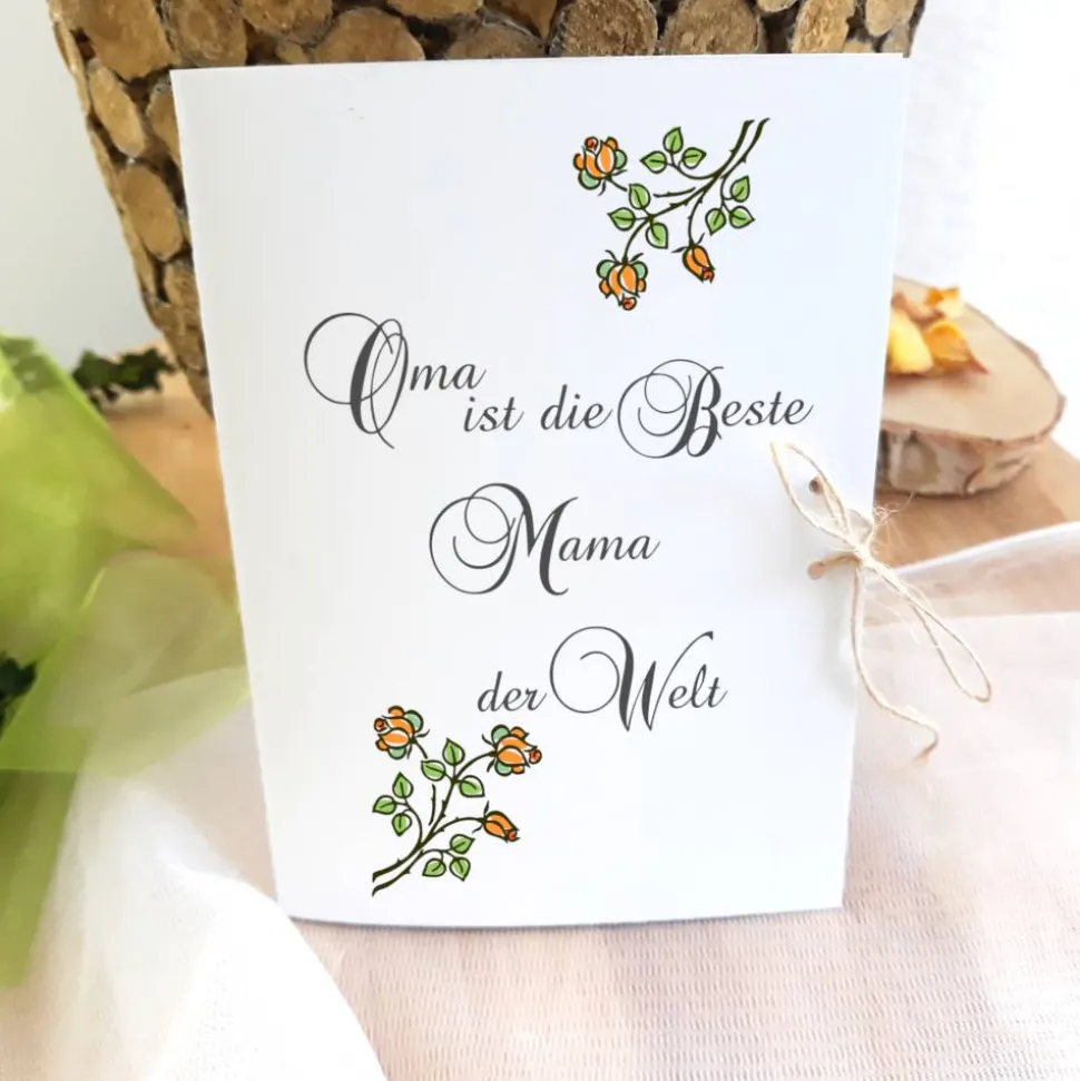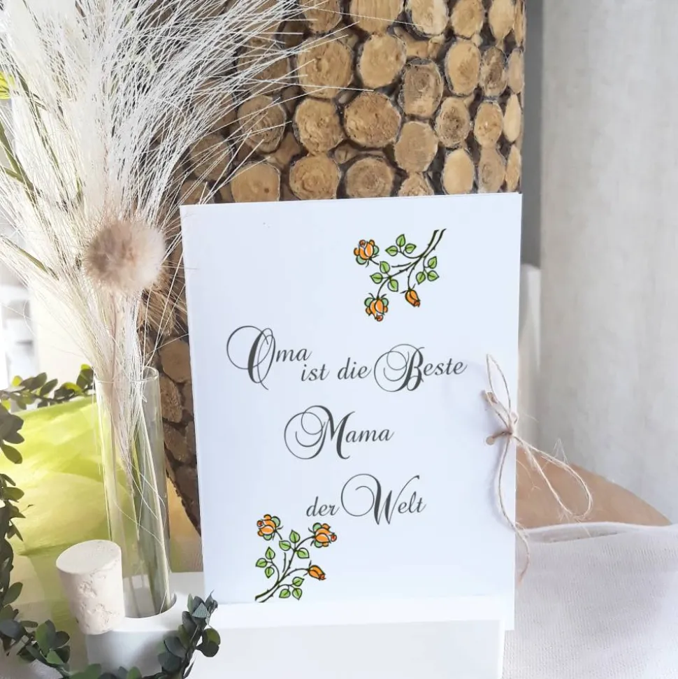 Das Geschenk-Set „Oma ist die beste Mama…“ ist perfekt geeignet als Geschenk zum Muttertag oder Geburtstag. Der Kartenhalter in weiß ist mit einer kleinen Vase versehen, in die kleine Blümchen gestellt werden können. So wird die Karte zu einer liebevollen Aufmerksamkeit. Im Inneren bietet die Grußkarte genug Platz für die persönlichen Worte. Egal ob Sie sich nur für die Karte oder das komplette Set entscheiden, es bereitet den Beschenkten viel Freude.