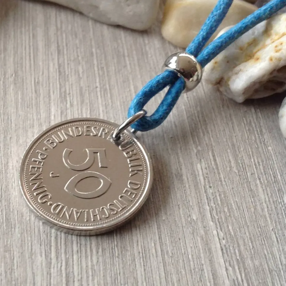 Ein gut erhaltenes 50-Pfennig-Stück von 1975 wurde durchbohrt und die Bohrung entgratet. Die Münze ist mit einer Edelstahlöse an der Kette befestigt. Die Kette ist aus blauer, gewachster Baumwollschnur ( ca 1,5 mm stark ) und 90 cm lang ( ohne Knoten und Perle gemessen ).