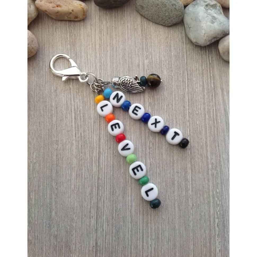Buchstabenperlen aus Kunststoff ( Durchmesser 7 mm ) bunte Rocailles in Regenbogenfarben, eine Metalleule und eine Tigeraugenperle sind auf Nietstiften aufgereiht. Diese sind mit Metallösen an dem Karabiner befestigt. Durch die komfortable Größe des Karabiners ( 2,1 cm ) lässt sich der Anhänger gut an Taschen, Schlüsselringen, Mäppchen etc. befestigen. Die Gesamtlänge des Anhängers beträgt 8 cm.