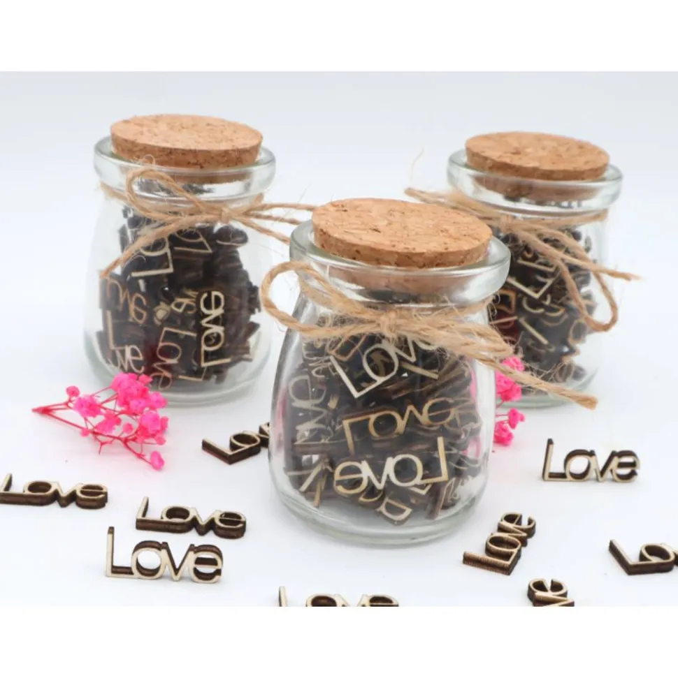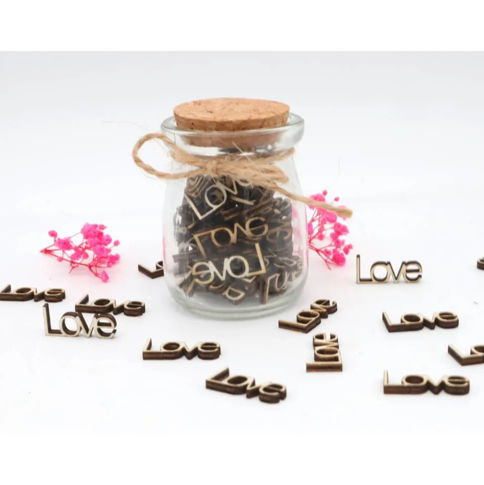 Dieses einzigartige Geschenkglas verfügt über aus Holz ausgeschnittene Worte „LOVE“.