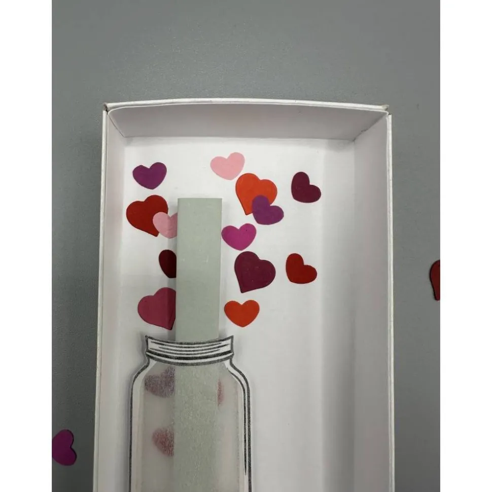 Im Innenteil der Schachtel wurde mit Hilfe von Transparentpapier ein Glas eingeklebt. Im Glas und auch darüber wurden gestanzte Herzen in verschiedenen Rottönen aufgeklebt, so dass der Eindruck entsteht, dass diese aus dem Glas fliegen.