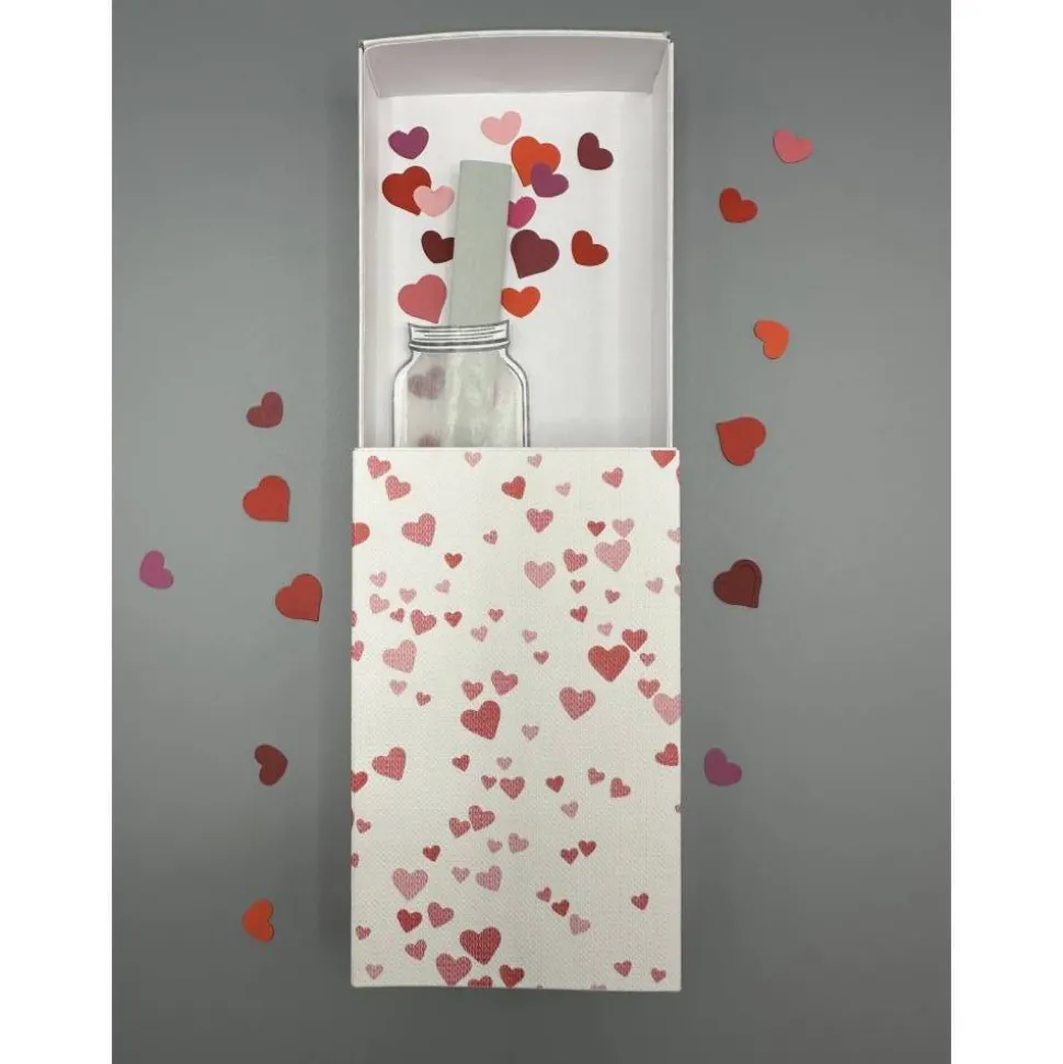Das Außenteil der Schiebeschachtel ist mit passendem Motivpapier mit vielen Herzen beklebt.