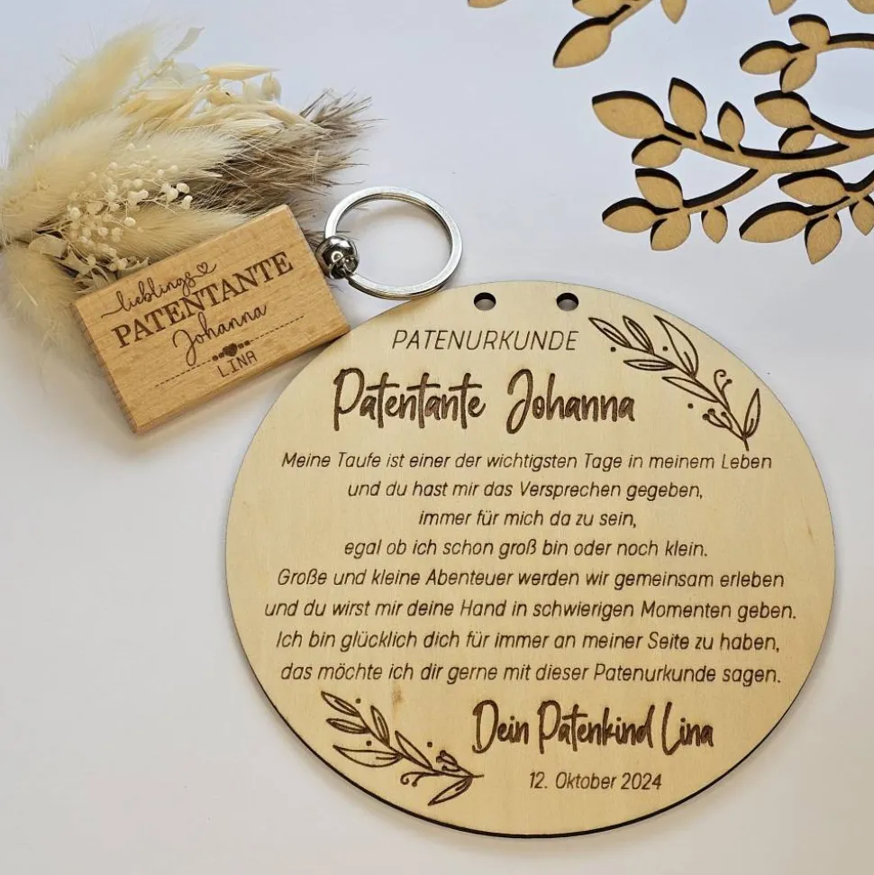 Als zusätzliches Taufgeschenk kann ein Schlüsselanhänger aus Holz für die Lieblings Patentante dazu bestellt werden.