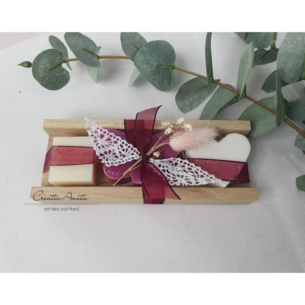 Herzen – Duftnote: Schneerose je 23g, Schmetterling – Duftnote: Orchidee 38g – Seifenwürfel: Classic 20g