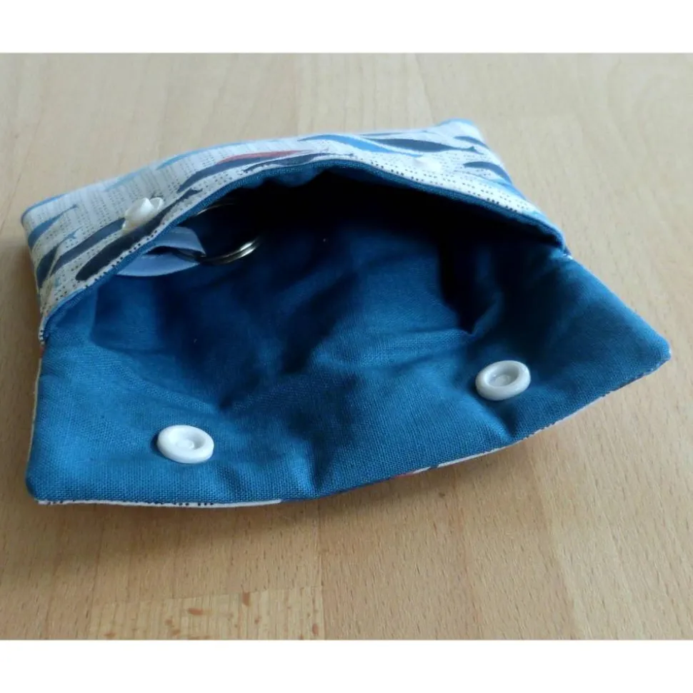 Kleines Etui für Kleingeld, Schlüssel, Karten oder für all die kleinen Dinge, die gerne mal in einer großen Tasche verloren gehen, außen aus weißem Biobaumwollstoff mit blauen Fischen, das Futter ist einfarbig blau. Zwischen den Stoffen wurde zur Stabilisierung ein dünnes Volumenvlies eingenäht. Das Etui wird mit einer Umschlagklappe mit 2 Druckknöpfen geschlossen, damit nichts herausfallen kann. Innen wurde eine Lasche aus Schrägband in die Seitennaht eingenäht, in die ein Schlüsselring eingehängt ist. Den Ring kann man entfernen, falls man das Täschchen nicht für Schlüssel verwenden will. Das Etui ist ca. 12 x 8,5 cm groß.