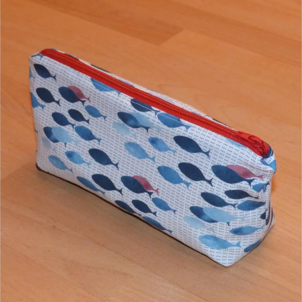 Federmäppchen oder Schminktäschchen aus weißem Biobaumwollstoff mit vielen blauen und ein paar roten Fischen. Für das Futter habe ich dazu passenden dunkelblauen Biobaumwollstoff gewählt. Zur Stabilisierung wurde ein dünnes Volumenvlies eingenäht. Das Etui wird mit einem Reißverschluss geschlossen. Aussen ist das Mäppchen ca. 22 x 10 cm groß, am Boden ist es ca. 5,5 cm breit.