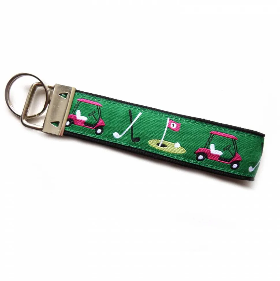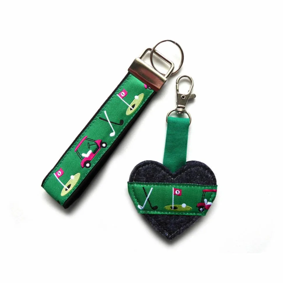 1 Schlüsselanhänger aus Baumwollstoff in schwarz mit einem aufgenähten Webband in grün mit Golf-Motiven (Golfschläger, hole in one, Caddy).