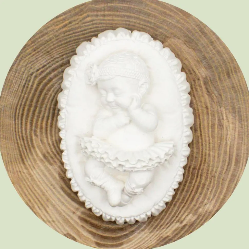 Eine entzückende Figur eines schlafenden Mädchens ruht friedlich in der Box und symbolisiert die unschuldige Ruhe des neuen Erdenbürgers. Sie verleiht dem Set eine besonders persönliche Note.