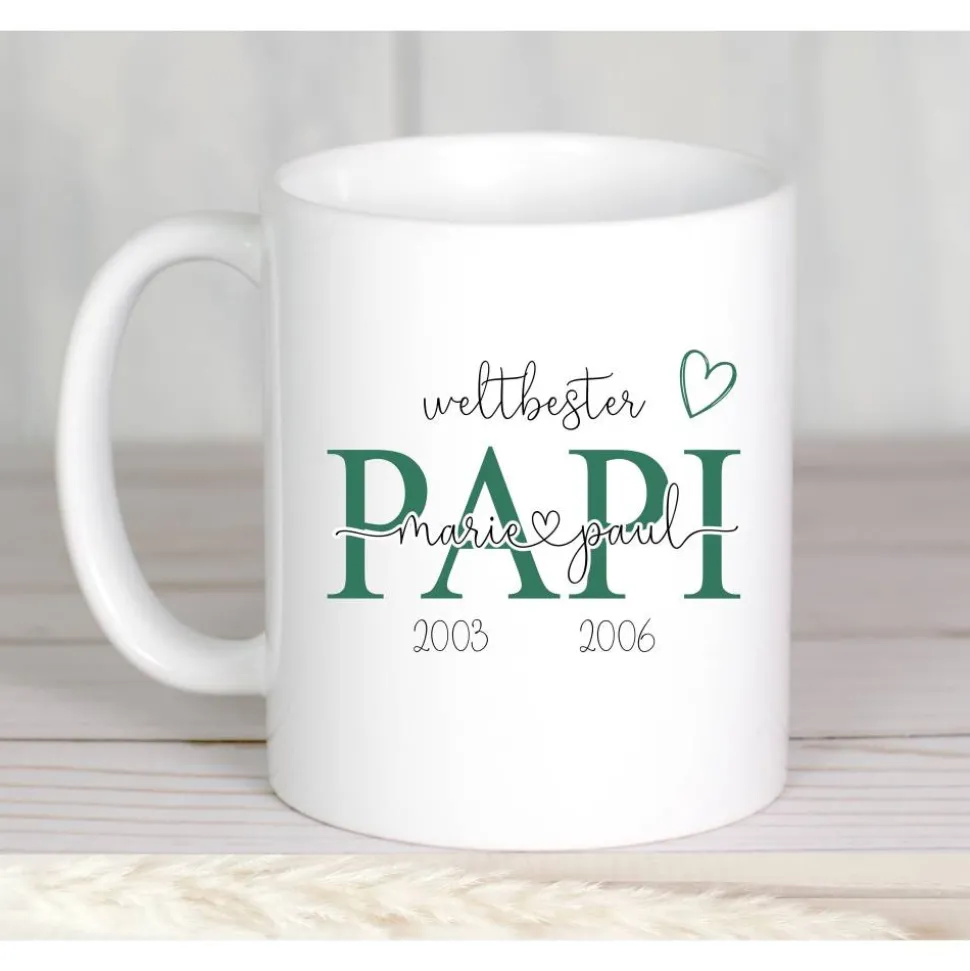 Der Schriftzug Opi wird mit den Namen der Enkelkinder und deren Geburtsjahr auf eine Kaffeetasse bedruckt.