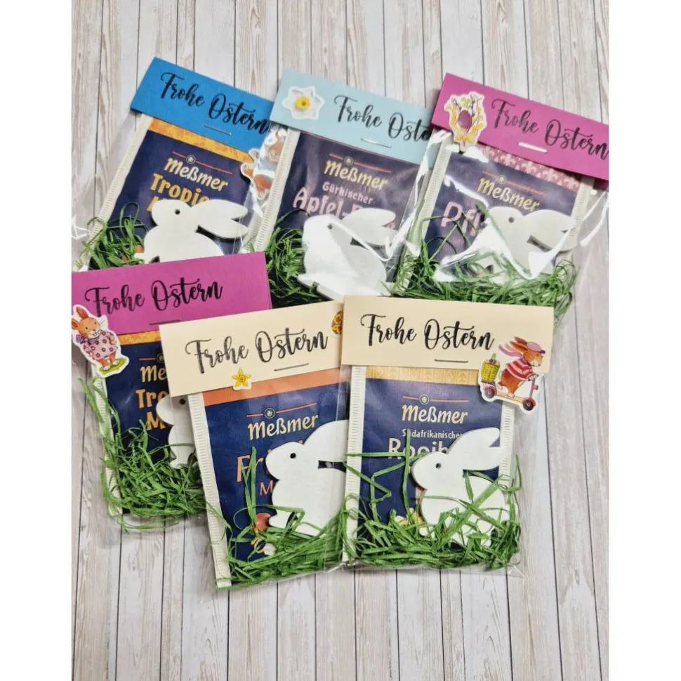 - Gefüllt mit je einem Teebeutel und einem Holzteilchen/Styroporei/Filzteil
