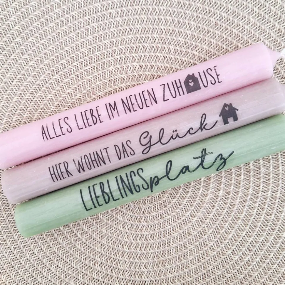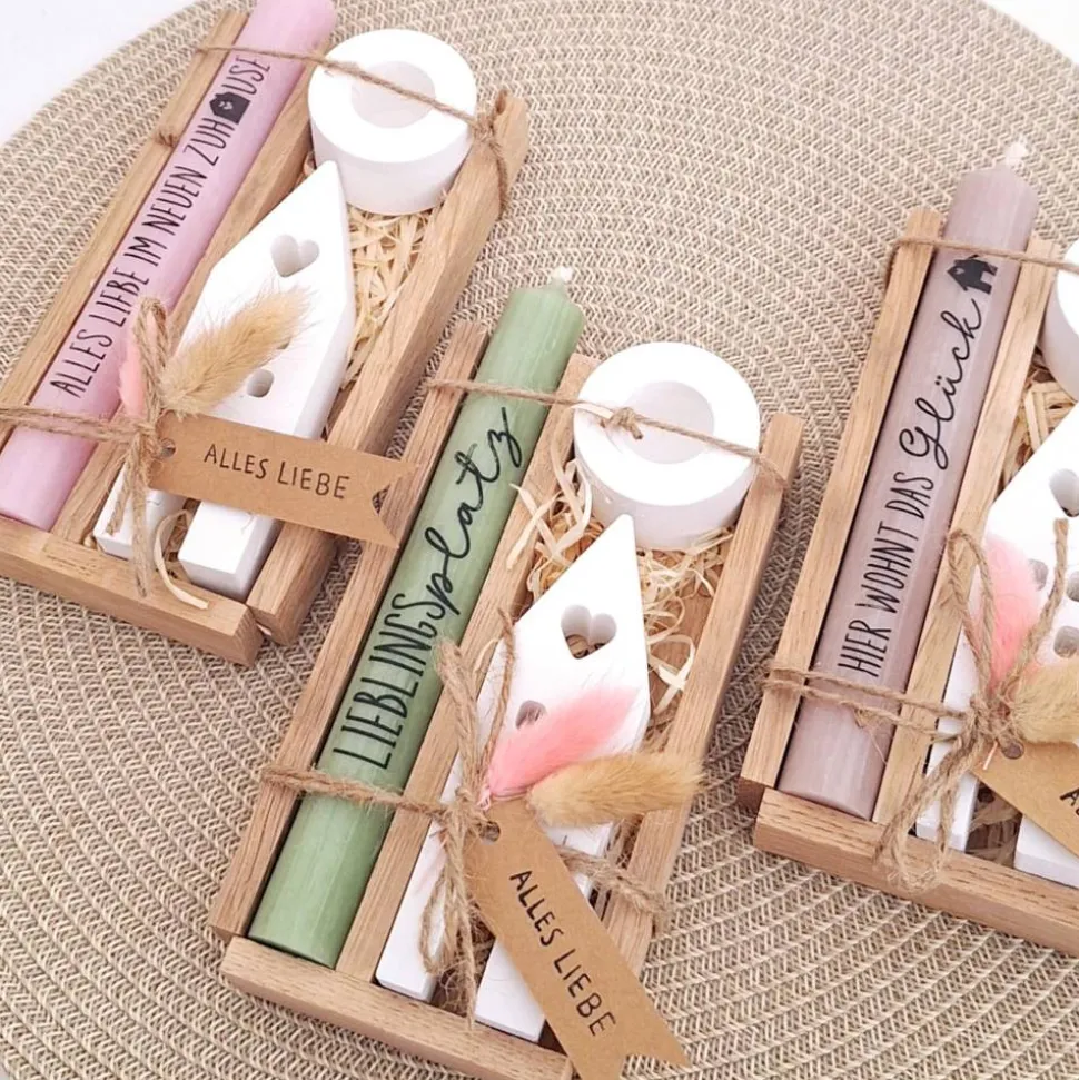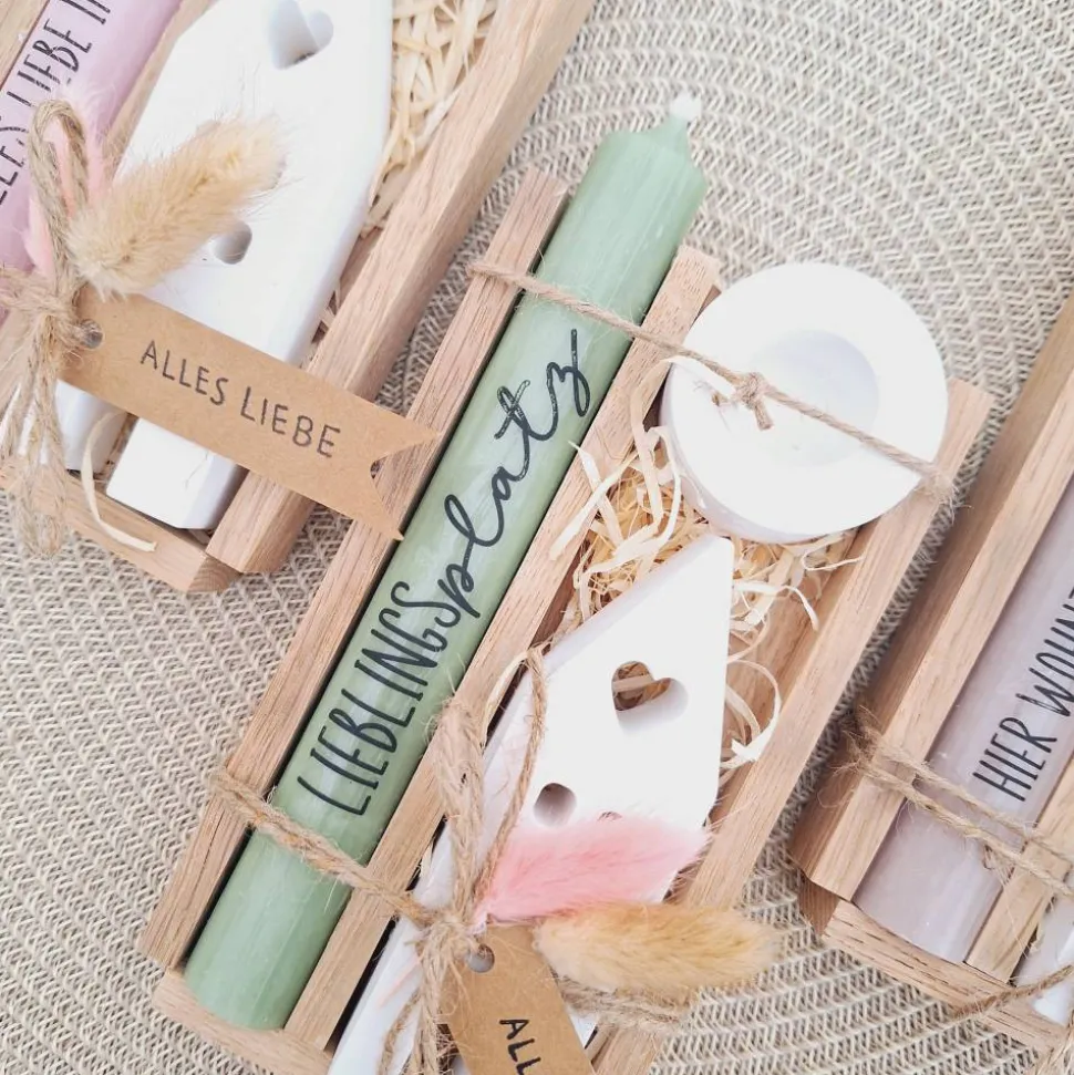 Das Kerzenset besteht aus einer Kerze (in der Farbe deiner Wahl) mit einer Aufschrift deiner Wahl, einem passenden runden Kerzenhalter und einem Haus / Lichthaus.