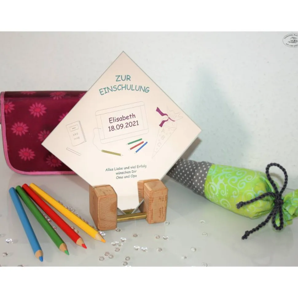 Dieser personalisierte Spiegel mit Holz-Standfuß ist ein tolles Geschenk zur Einschulung und Erinnerung an diesen großen und besonderen Tag.