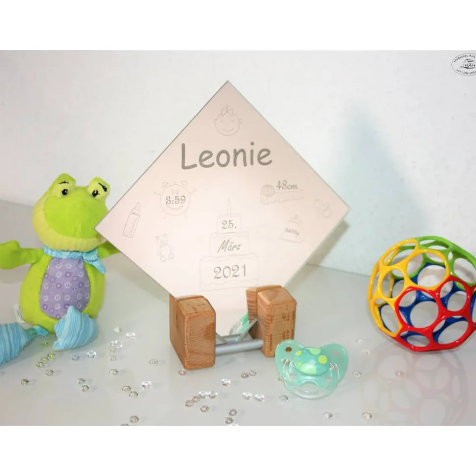 Dieser personalisierte Spiegel mit Holz-Standfuß ist ein tolles Geschenk zur Geburt und als persönliche Erinnerung.