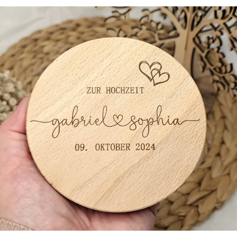 Überrasche das Brautpaar mit diesem einzigartigen Geschenk, das ihre Namen und ihr Hochzeitsdatum kunstvoll auf dem Holzdeckel verewigt.