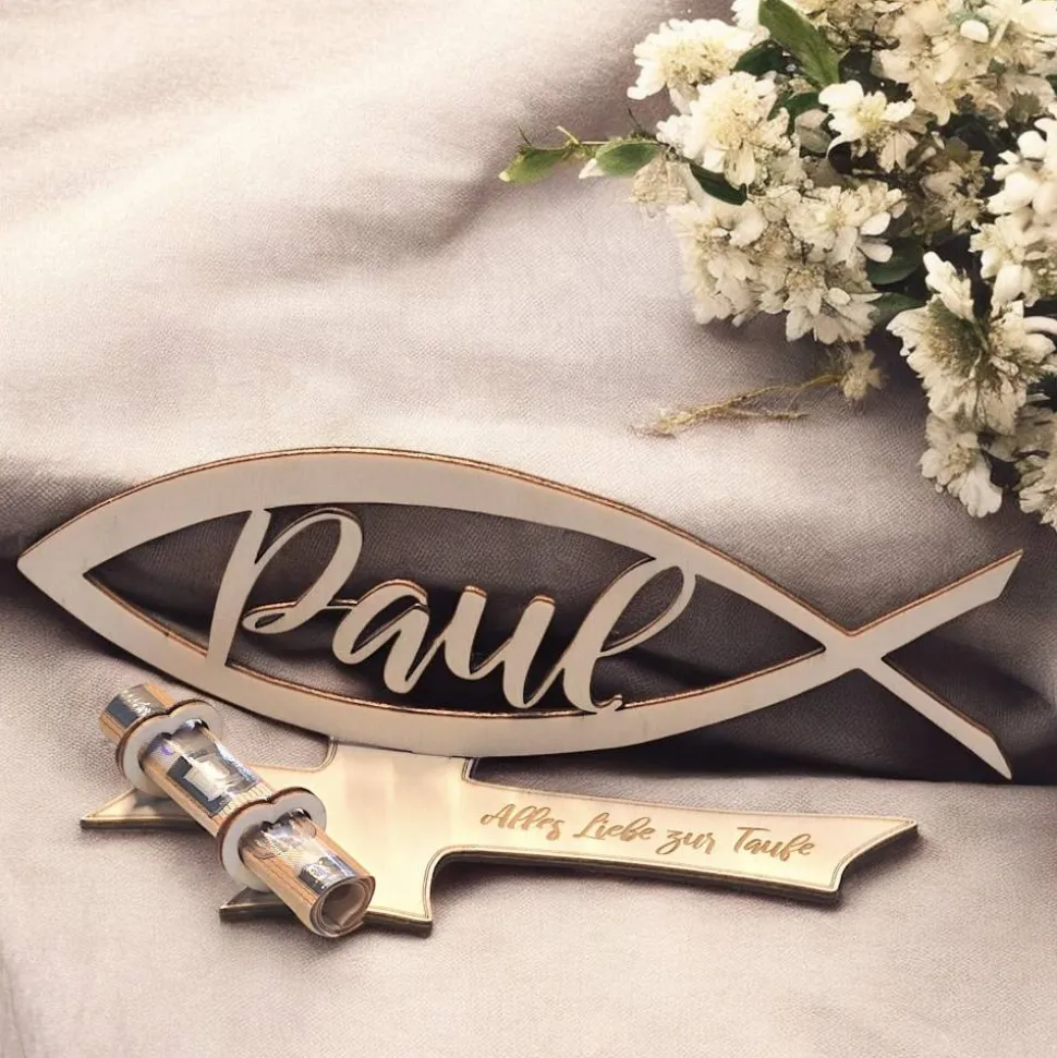 Der Name des Täuflings wird in das Holz eingearbeitet, was den Fisch zu einem unvergesslichen Erinnerungsstück macht. Die hochwertige Verarbeitung und die dauerhafte Gravur sorgen dafür, dass das Geschenk ein Leben lang hält.