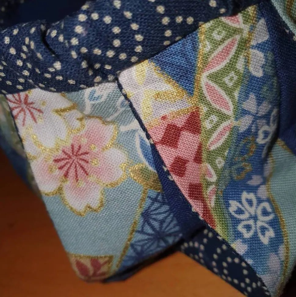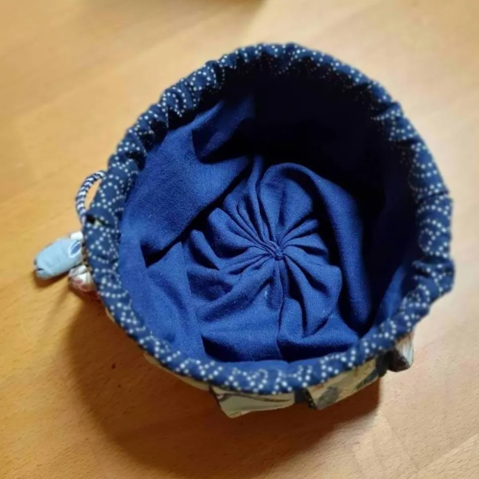 Dieser handgefertigte Beutel mit Kordelzug ist inspiriert von dieser schönen Tradition. Er wurde im Patchwork-Stil gefertigt – teilweise in sorgfältiger Handarbeit und nach japanischen Vorlagen. Verarbeitet wurden hochwertige, japanische Designerstoffe aus 100 % Baumwolle, darunter Stoffe von Sevenberry. Ein Teil der originalen Webkanten mit Schriftzeichen ist dekorativ am Rand erhalten geblieben, ergänzt durch ein kleines Etikett aus veganem Lederpapier.