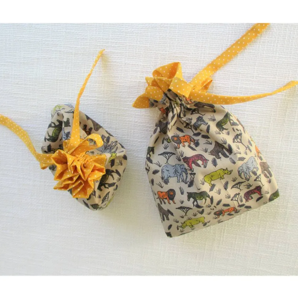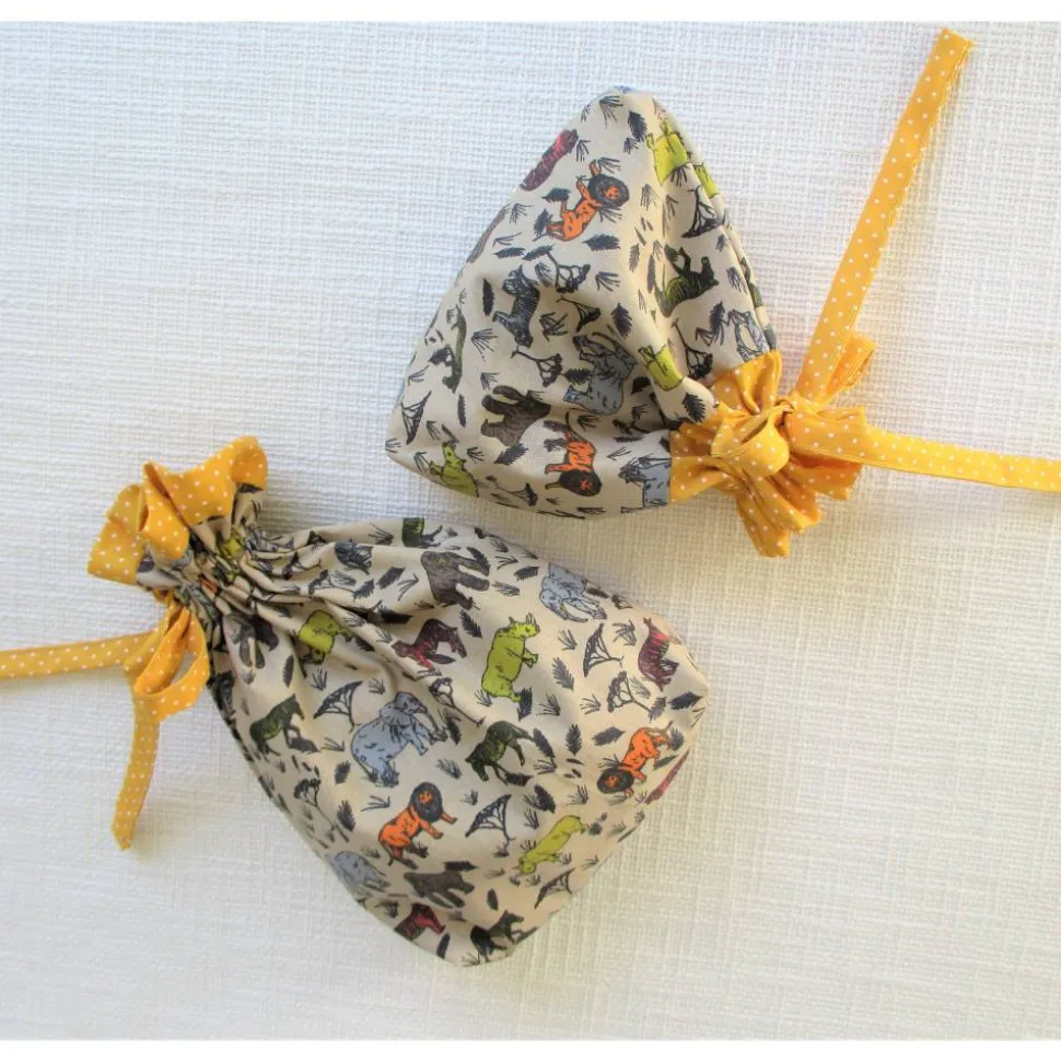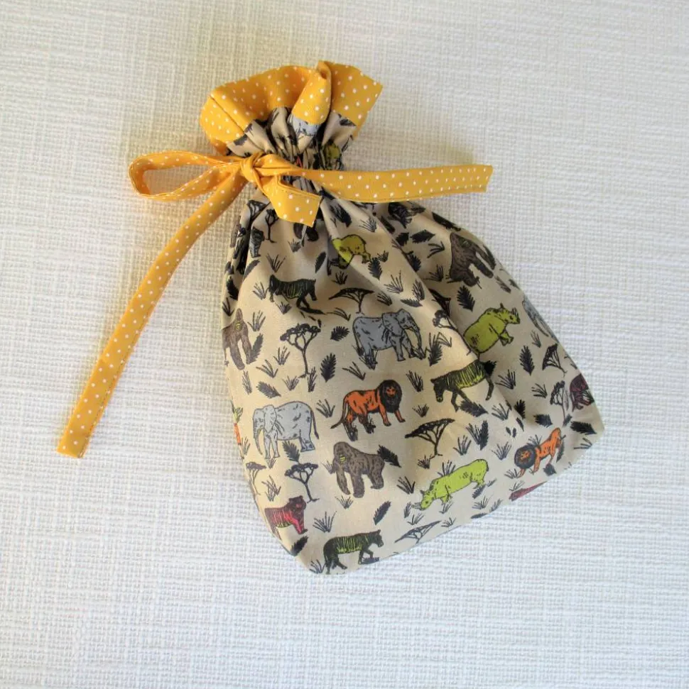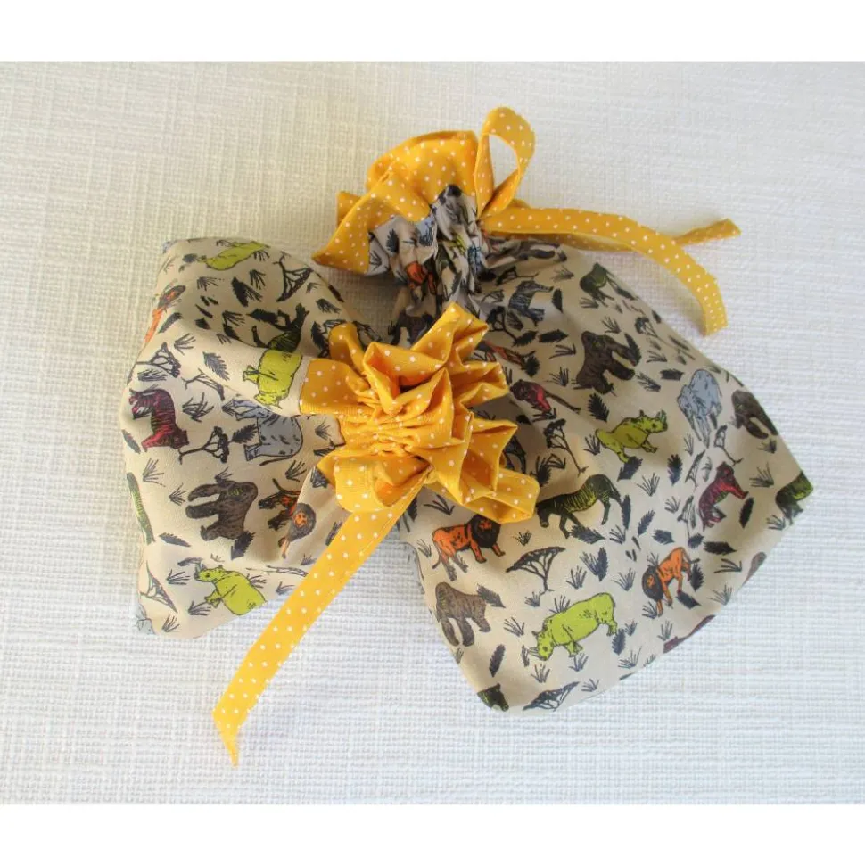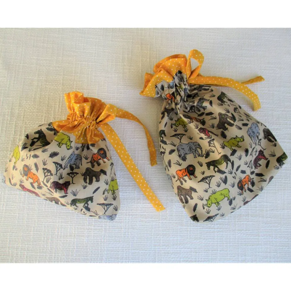 Beide Beutel sind genäht aus Baumwollstoff mit Zootieren darauf. Der Rand in Kontrastfarbe gelb mit weißen Punkten.
