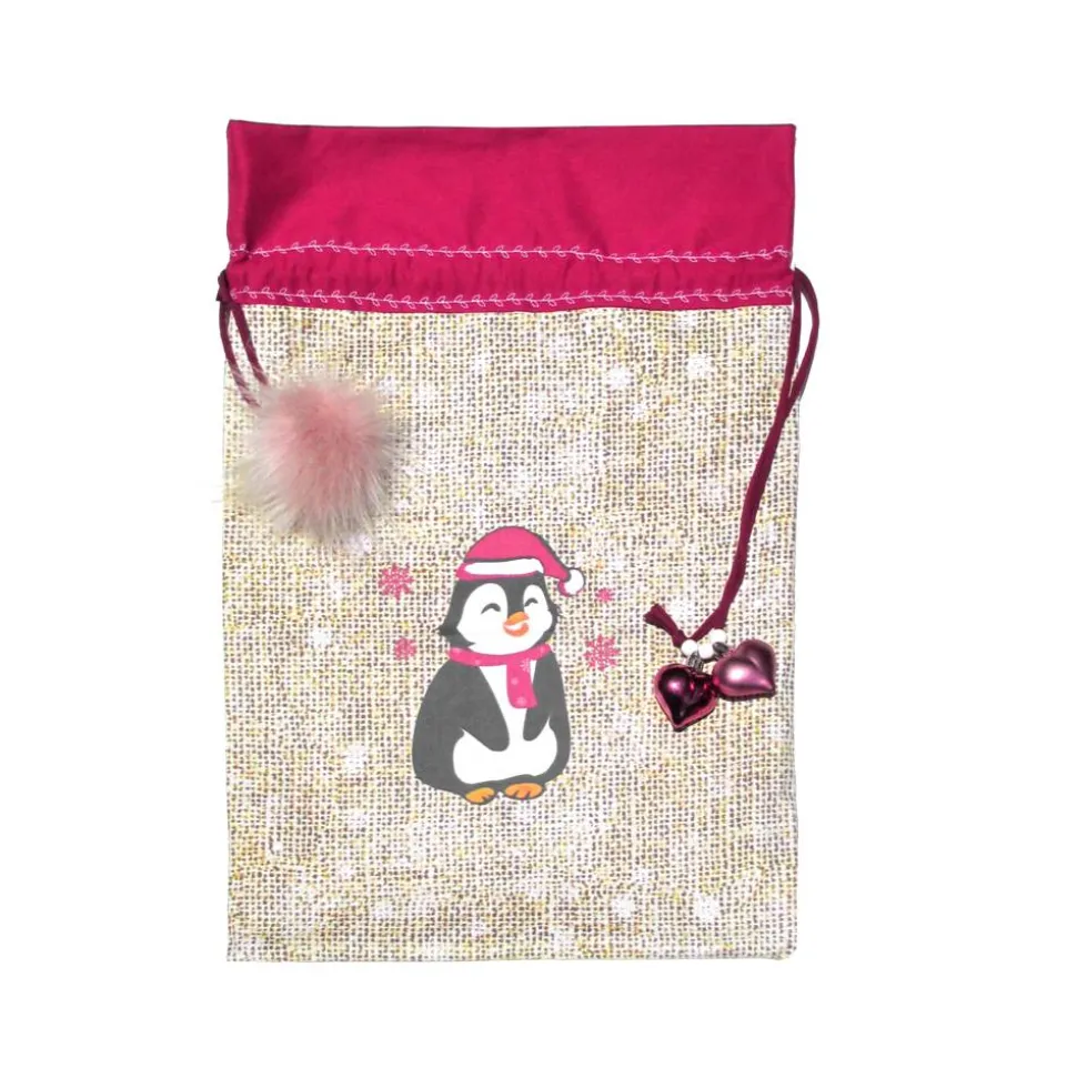Liebevolle Details für unvergessliche Momente: Der niedliche Pinguin mit Schneeflocken bringt winterlichen Charme in jedes Geschenk. Der Tunnelzug ist mit einem eleganten weißen Stickmuster verziert. Die dunkelroten Textilgarnbänder ermöglichen ein einfaches Öffnen und Schließen. Besonderes Highlight: An den Bändern findest du eine rosa Kunstfellbommel, zwei rosa Herzen und weiße Holzkugeln – alles handgenäht in der schönen Pfalz.