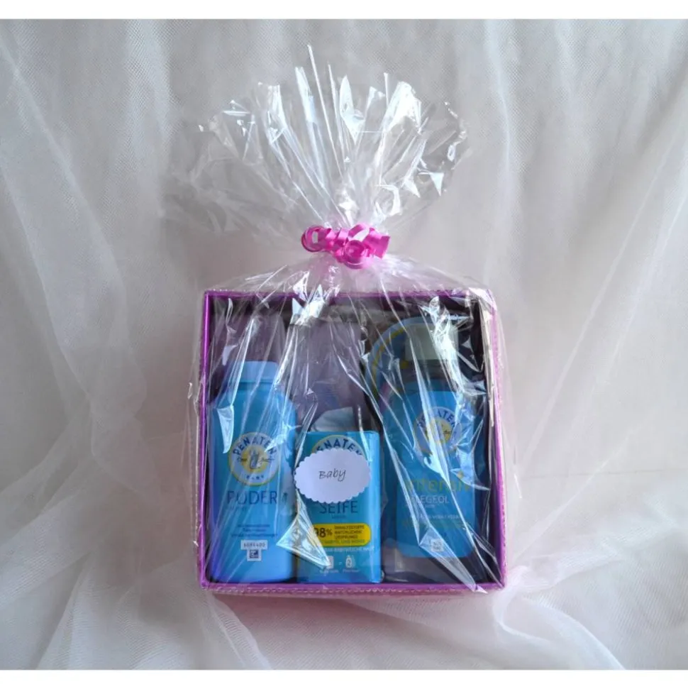 Geschenkbox gefüllt mit zwei Paar Frotteesöckchen (Produkt einer Drogeriekette), 0-6 Monate, mit kuschelig weicher Innenseite. Bei 30 ° waschbar sowie mit Seife, Puder, Creme und Öl. Ideales Geschenk zur Geburt oder Taufe. Die Box ist aus stabilem Karton, der mit Stoff und Strassbordüre beklebt ist. Sie kann später auch als Aufbewahrungsbox verwendet werden. Die Box ist mit Folie verpackt und hat einen Aufkleber „Baby“ so kann sie gleich verschenkt werden.