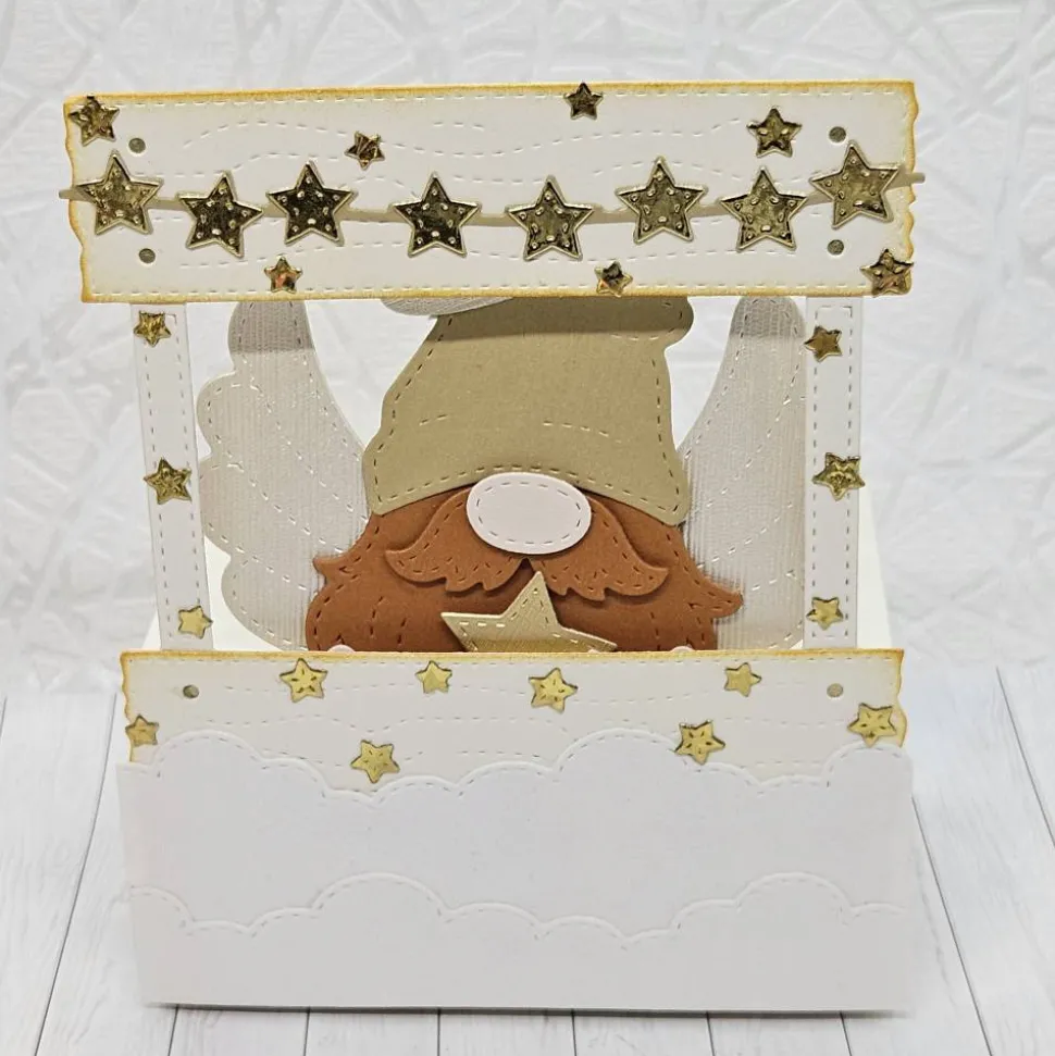 Ein kleiner Schutzengel in Wichtelform, gefertigt aus hochwertigem Fotokarton der Stärke 300g/m² und edlen Effektkartons, wartet darauf, einem lieben Menschen Glück zu bringen. In verschiedenen Weißtönen mit goldenen Akzenten sitzt das süße Engelchen an seiner Bude in den Wolken und poliert Sternchen, damit sie immer schön funkeln.