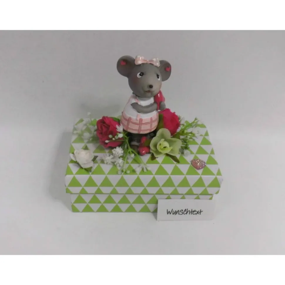 Maße: 12,5 x 7,5 x 5,5 cm (ohne Figur), Höhe mit Figuren 14,5 cm. Den Text deiner Wahl kannst du individuell anbringen lassen – entweder vorn an der Schachtel oder im Deckel, ganz wie du möchtest. Dieser Service ist im Preis enthalten!