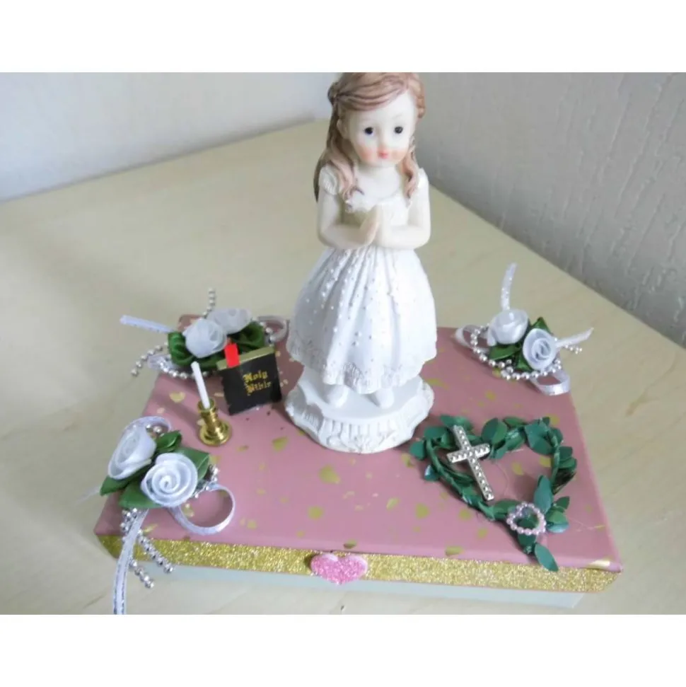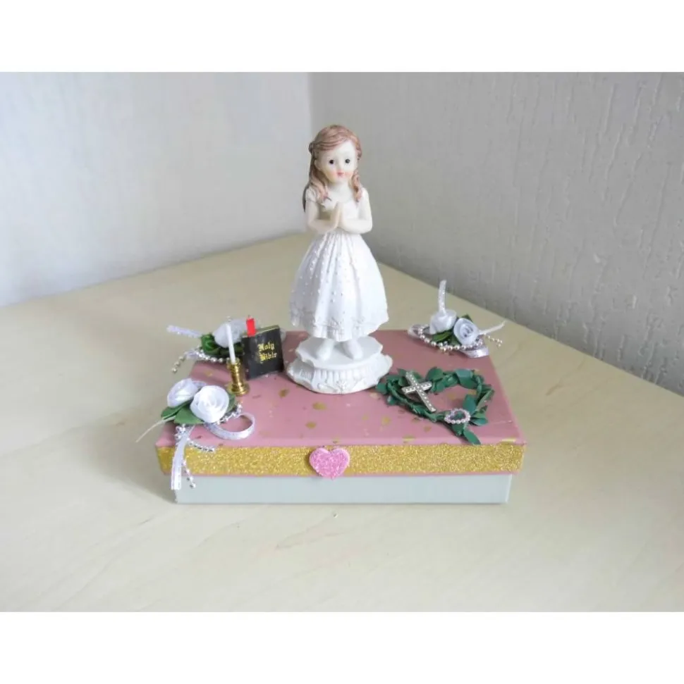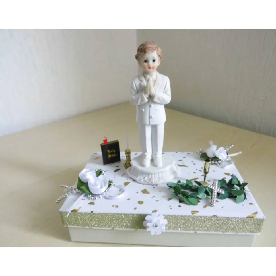 Diese liebevoll gestaltete Geschenkbox eignet sich perfekt für die Kommunion, Konfirmation oder Firmung eines Jungen oder Mädchens. Die dekorative Box ist aufwendig verziert mit einem betenden Jungen, umgeben von zahlreichen Dekoelementen und Blüten. Sie bietet ausreichend Platz für Geldgeschenke, Glückwunschkarten oder kleine Aufmerksamkeiten.