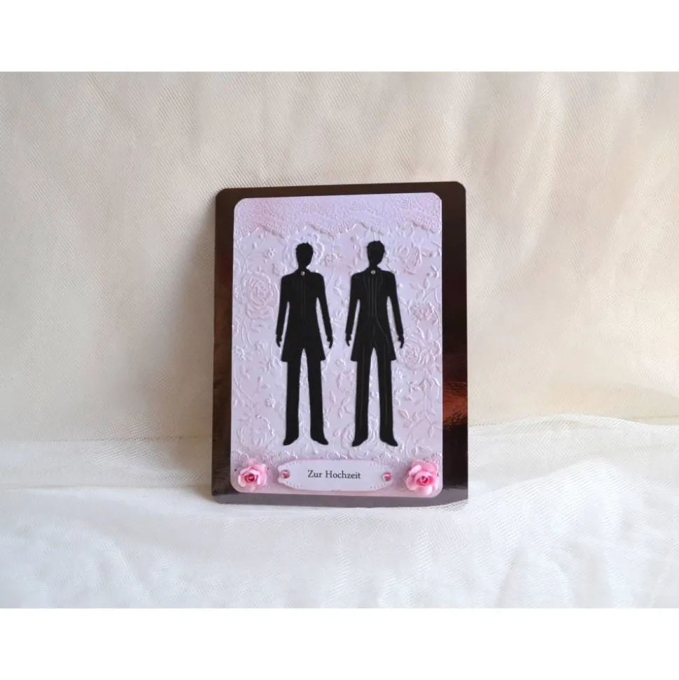 Wunderschön gestaltete Geschenkbox aus Spiegelkarton mit Karte zur Hochzeit für zwei Männer. Die Karte ist mit Stanz- und Prägekarton, zwei kleinen Papierblume sowie einem Schild „Zur Hochzeit“ verziert. Der Deckel der Box ist mit Stickern und einer bordoroten Stoffblume verziert. Im Inneren der Karte befindet sich ein kleines Kuvert für Geld oder Gutschein. Eine schöne Geschenkidee zur Hochzeit.