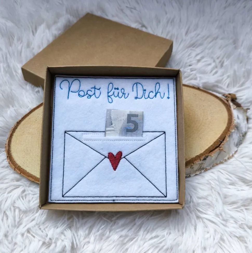Die handliche Box (ca. 12 x 12 x 1,5 cm) bietet Platz für gängige Gutscheinkarten im EC-Karten-Format, kann aber auch mit Geld, Süßigkeiten oder kleinen Aufmerksamkeiten gefüllt werden – ganz nach deinem Geschmack und der bestickte Filzeinleger verleiht der Box eine wunderschöne, persönliche Note.