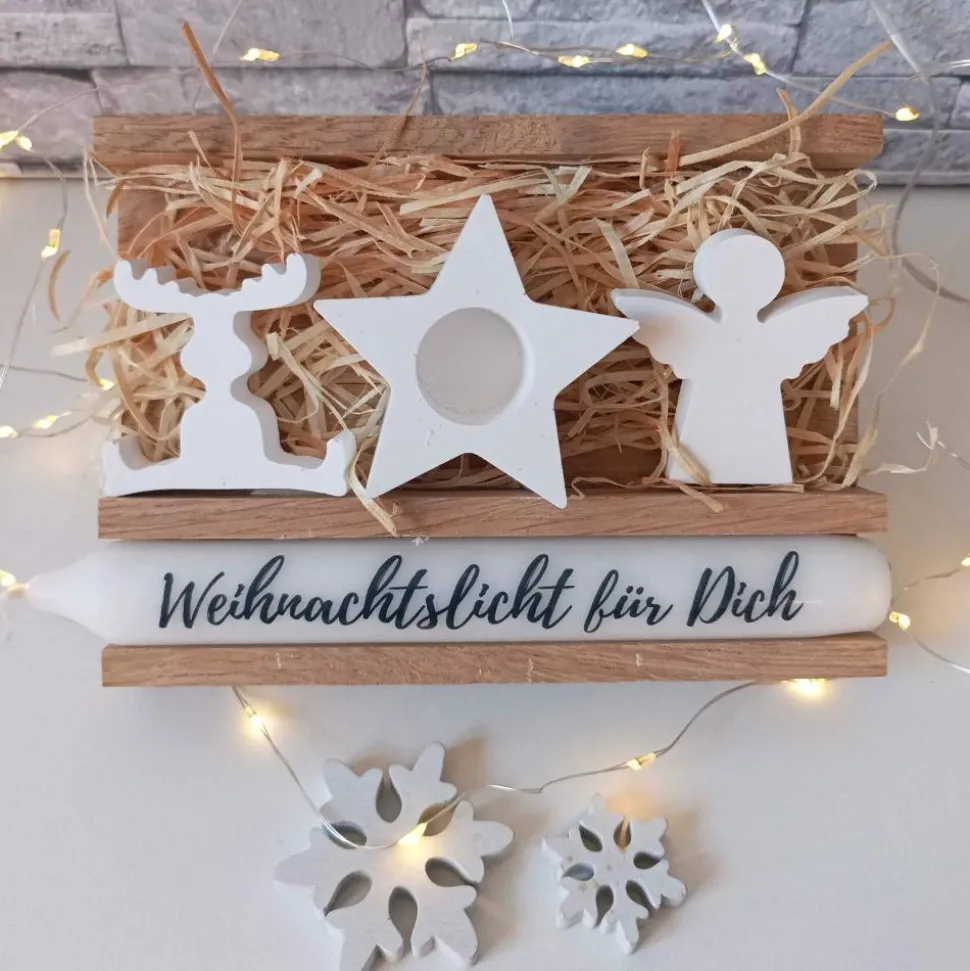 Dieses liebevoll gestaltete Kerzenset Weihnachten verzaubert mit einem Mix aus handgefertigten Deko-Elementen aus Raysin und einer dekorativen Kerze. Die Kerze trägt den Spruch „Weihnachtslicht für Dich“ und wird von einem stilvollen Stern-Kerzenhalter, einem Elch und einem Engel aus dem hochwertigen Material Raysin begleitet. Jedes Stück ist ein Unikat und mit Sorgfalt gefertigt, um die Magie der Weihnachtszeit bei dir einzufangen.